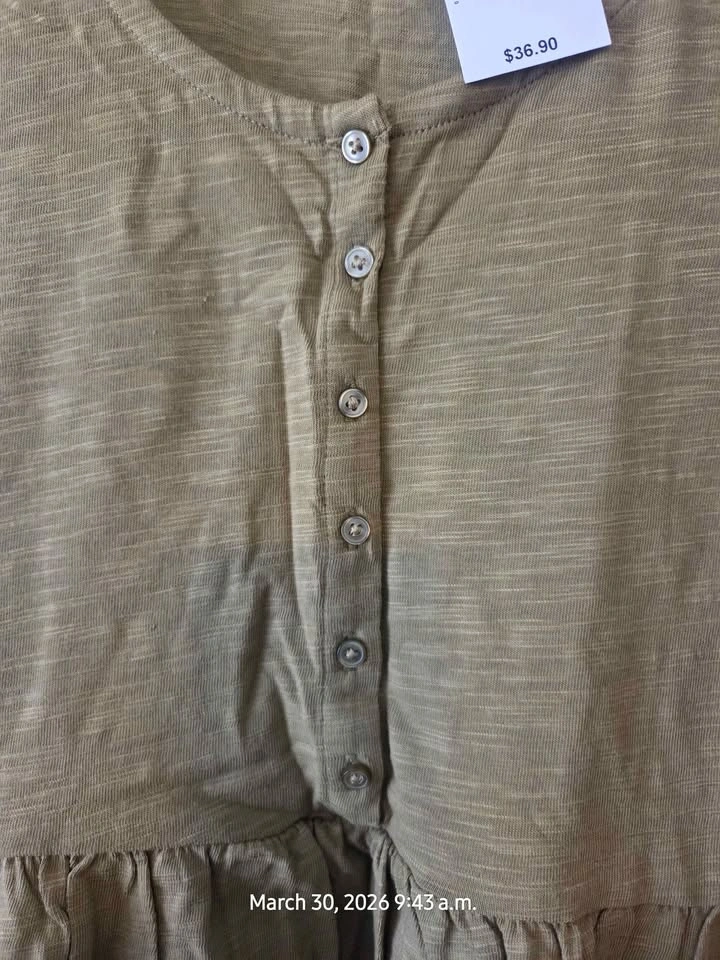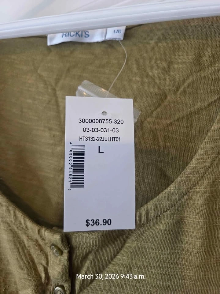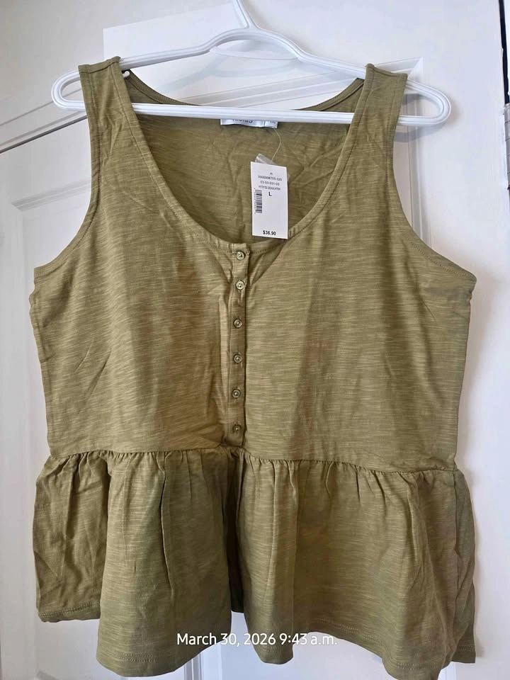 New Ricki's tank top in olive green with a peplum hem. Sleeveless with a button-front henley neckline. Size Large.