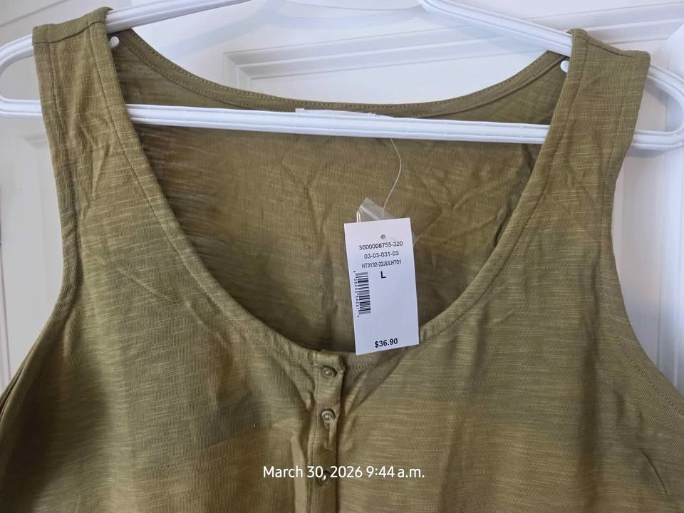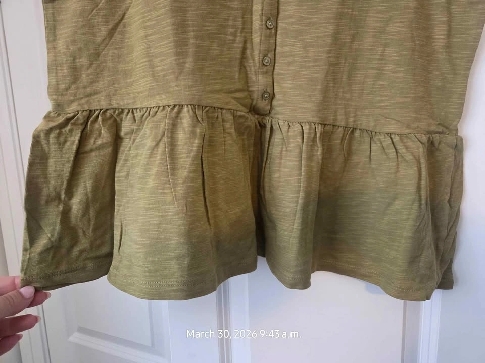 New Ricki's tank top in olive green with a peplum hem. Sleeveless with a button-front henley neckline. Size Large.