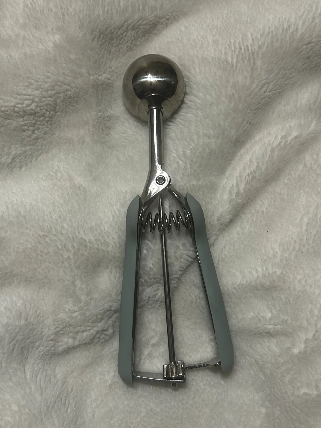 This is a metal ice cream scoop with a grey handle. It's a standard size for dishing ice cream. This scoop would be handy for making perfect ice cream portions!