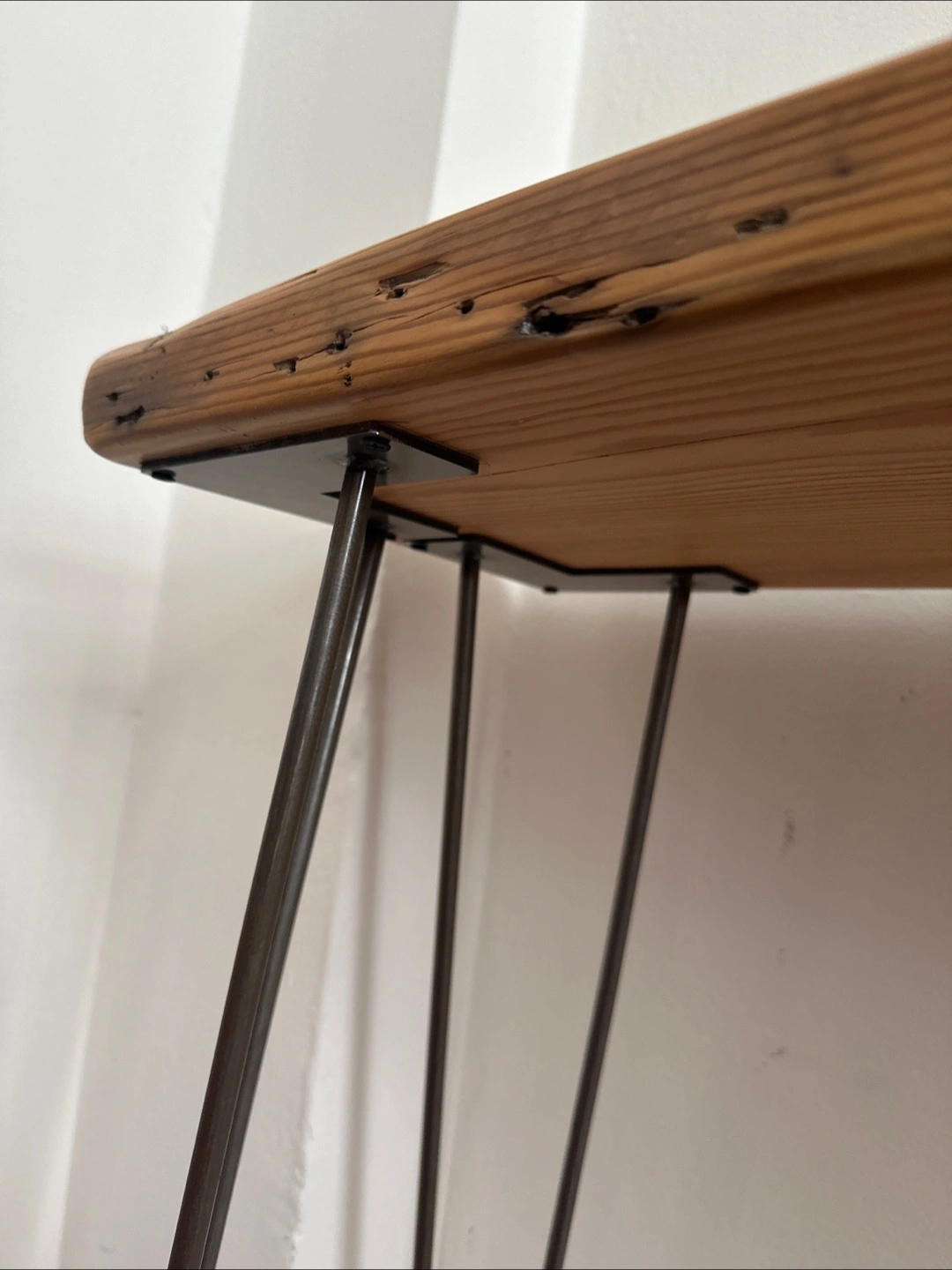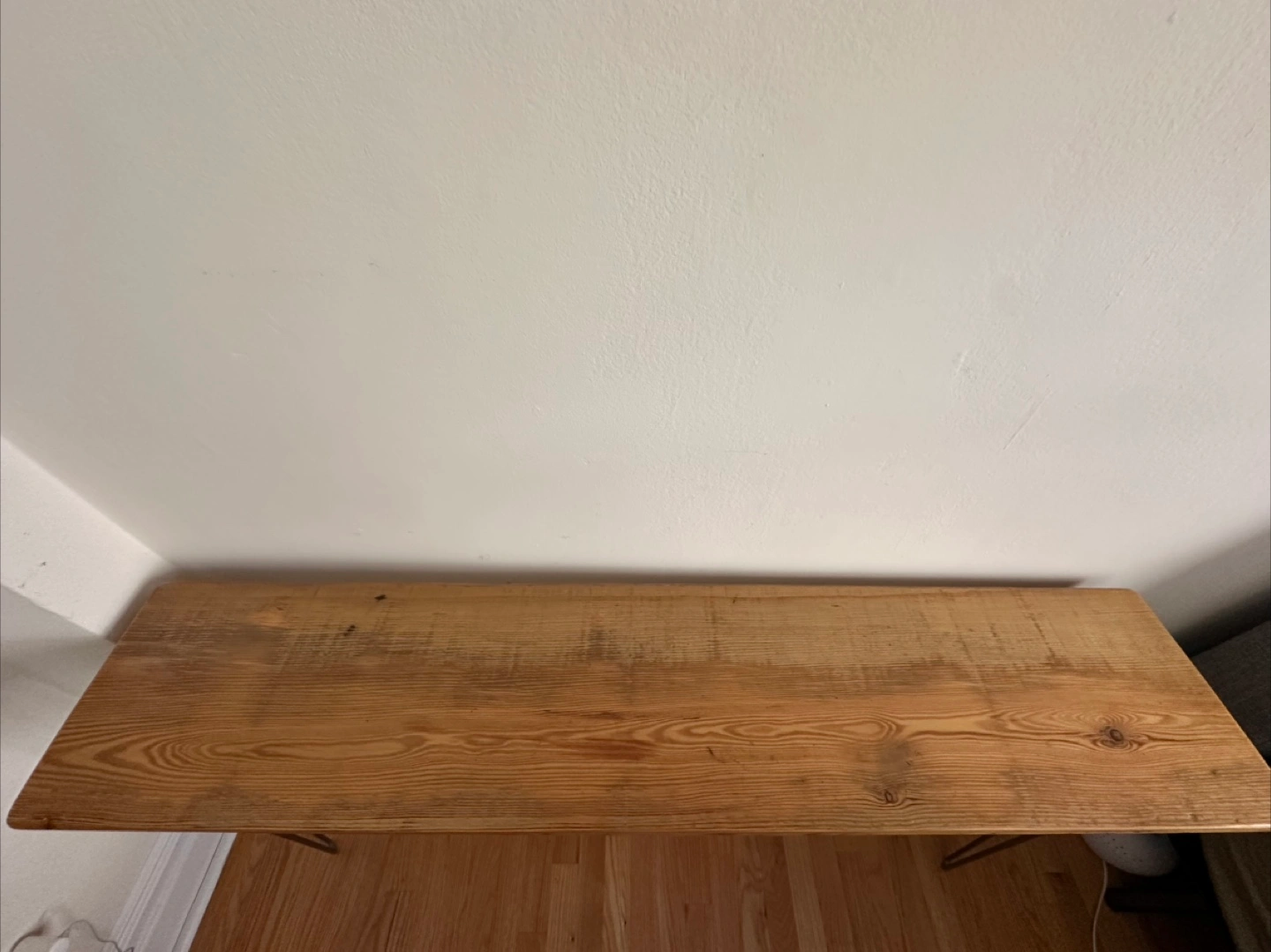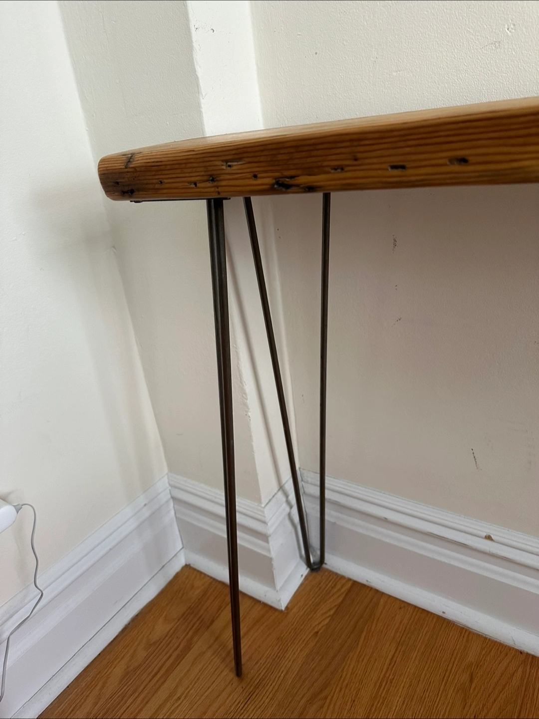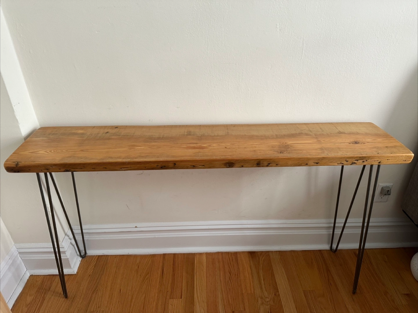 Long console table. Beautiful solid rustic wood top. Dark metal hairpin legs. Great condition. Industrial, rustic design. Perfect for entryway or living room.
