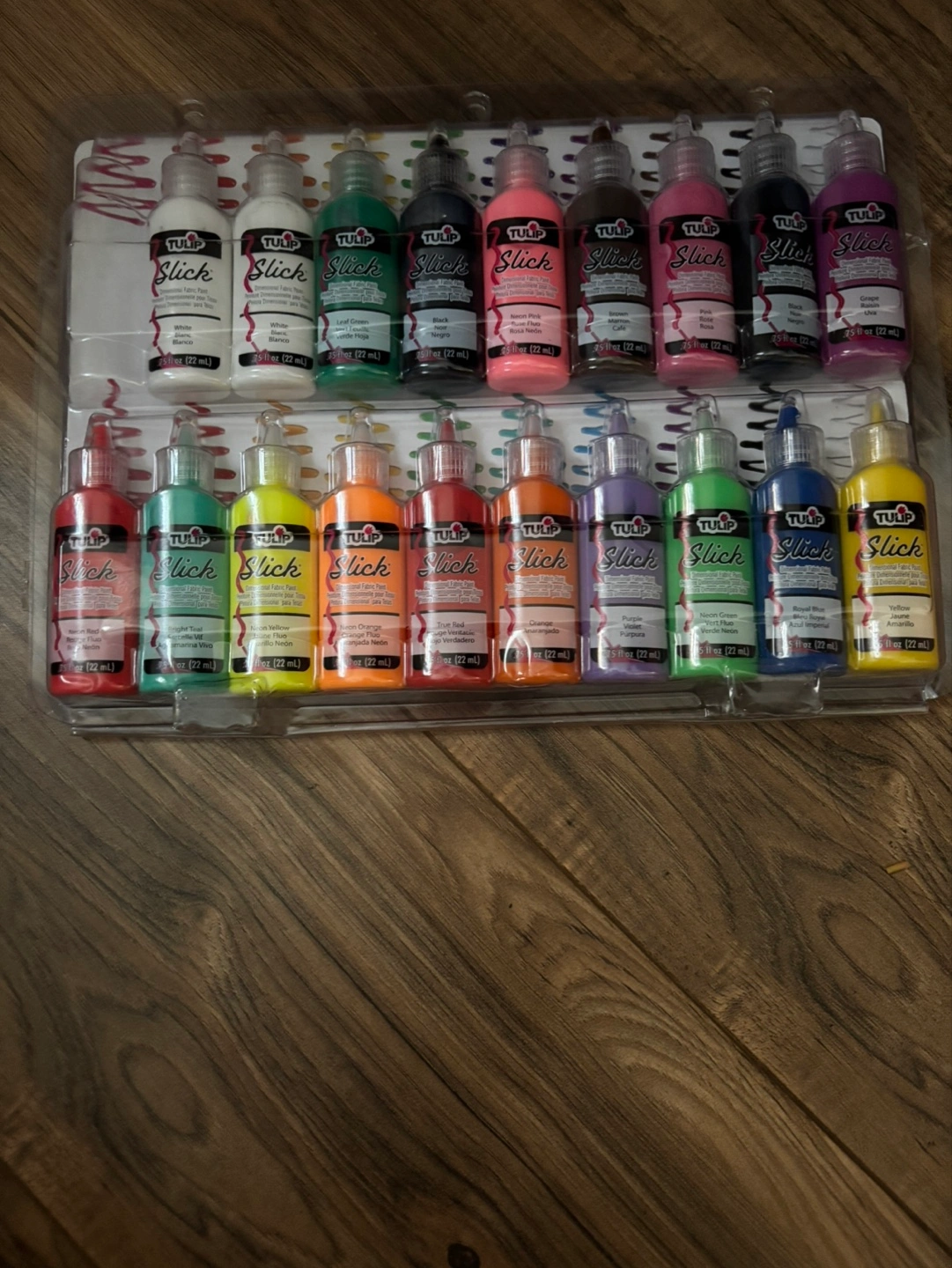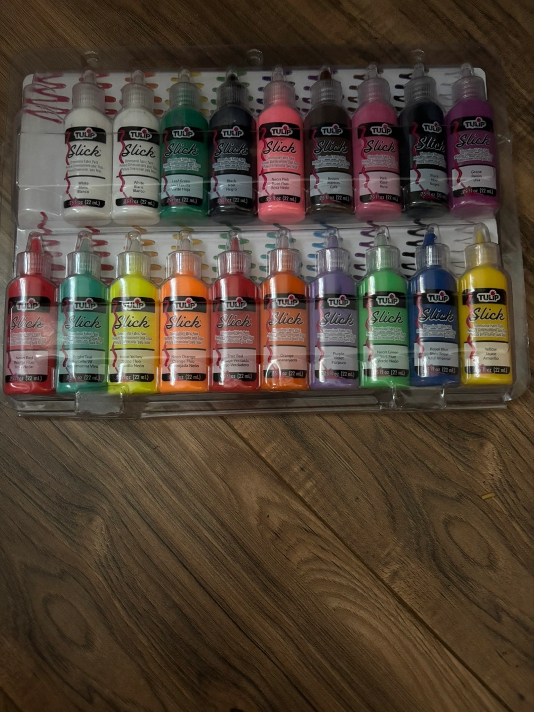 New, sealed 24-bottle set of TULIP Slick fabric paints. Vibrant colors, perfect for DIY projects. Each bottle 2 oz.
