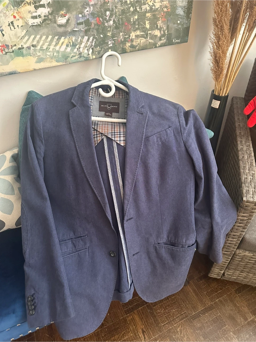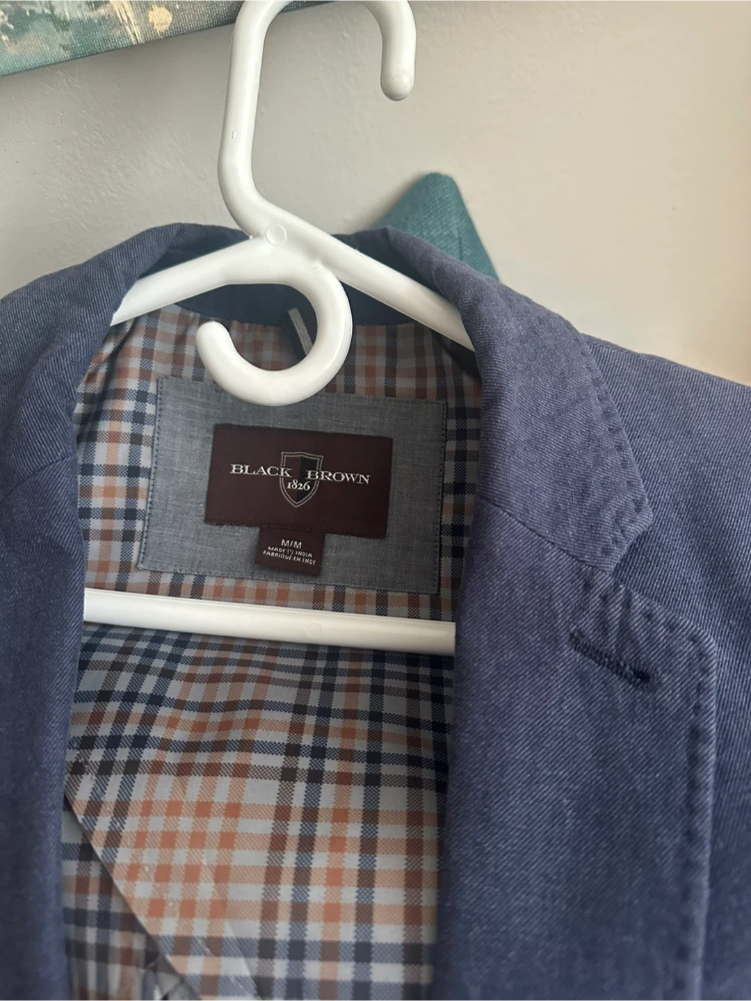 This is a navy blue blazer from Black Brown 1826. It's a size M/M. The jacket features a plaid lining. It's a stylish addition for any occasion!
