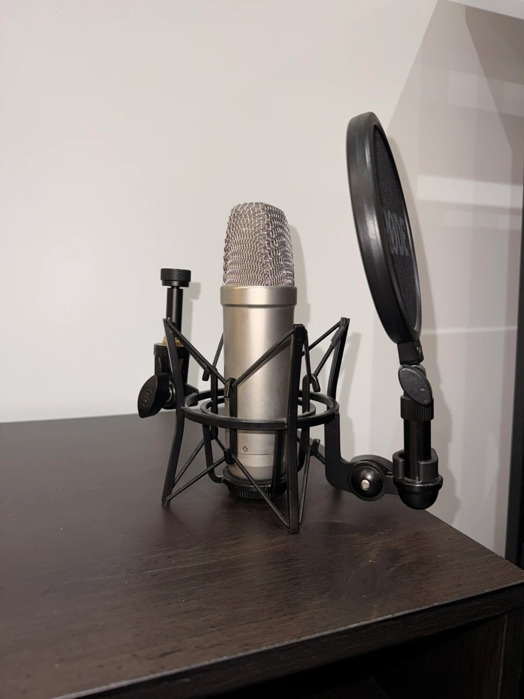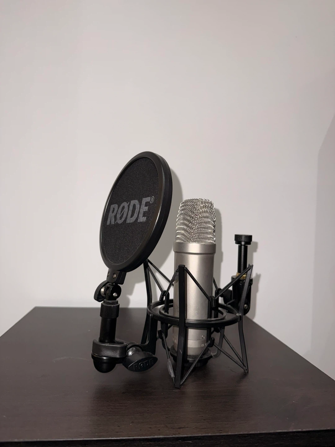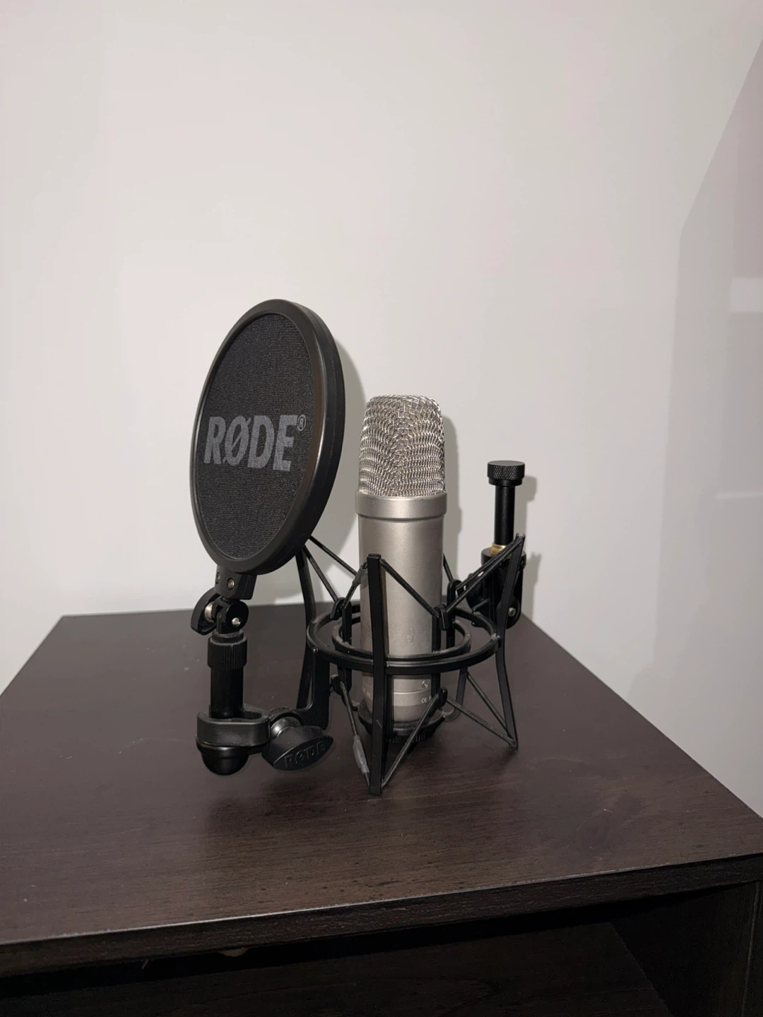 This is a Rode NT1-A condenser microphone. It comes with a shock mount and a pop filter. Great for vocals and acoustic instruments!