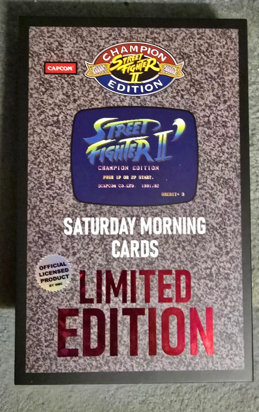 This is a limited edition box of Street Fighter II Champion Edition Saturday Morning Cards. It's an officially licensed product by Capcom and SMC. These cards are a collector's item for fans of the classic fighting game.