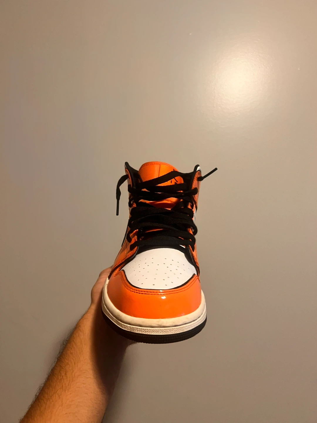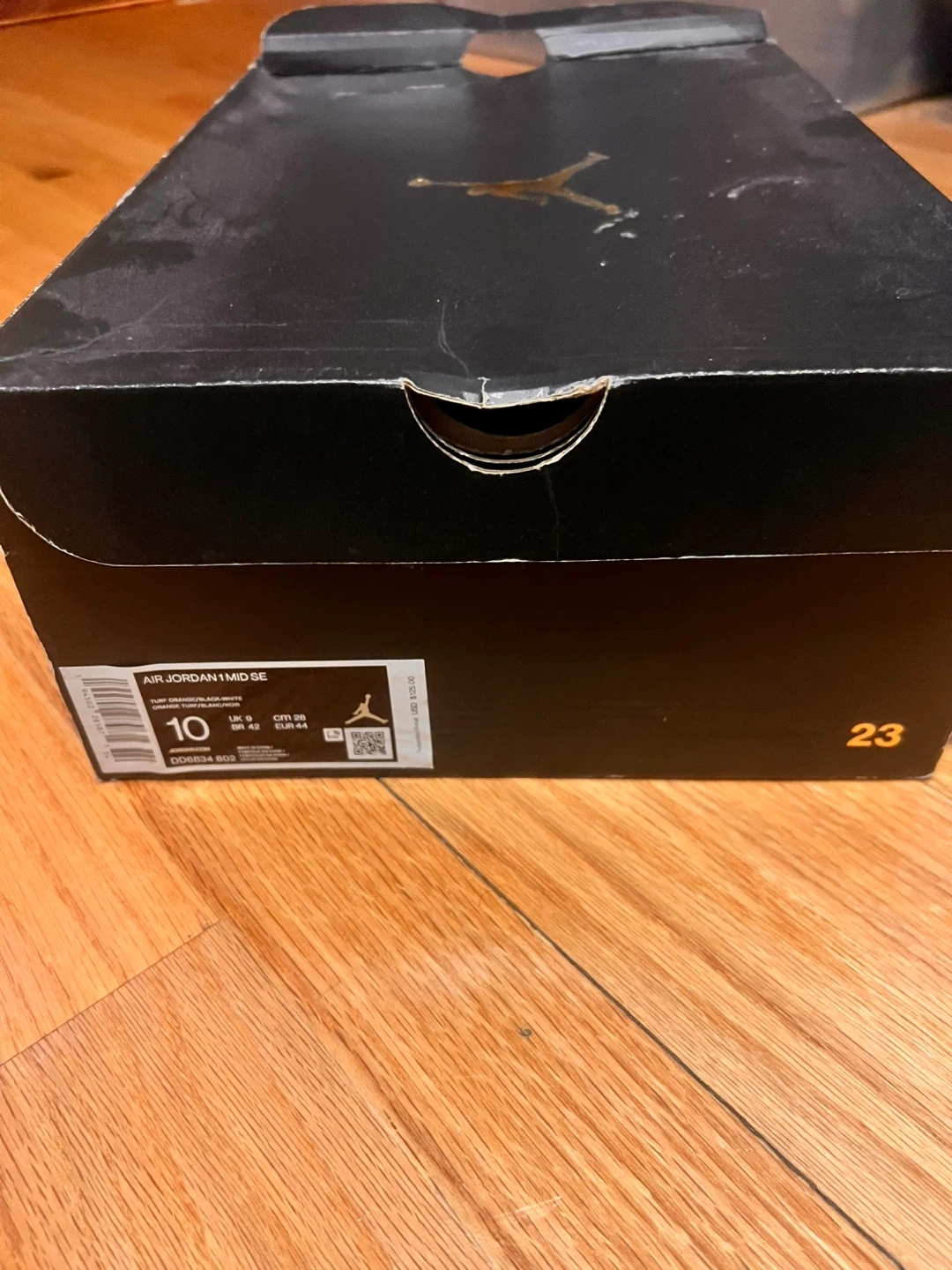 These Air Jordan 1 Mid SE sneakers come in a vibrant orange, white, and black colorway. They're a men's size 10 US. Includes original box. Used.