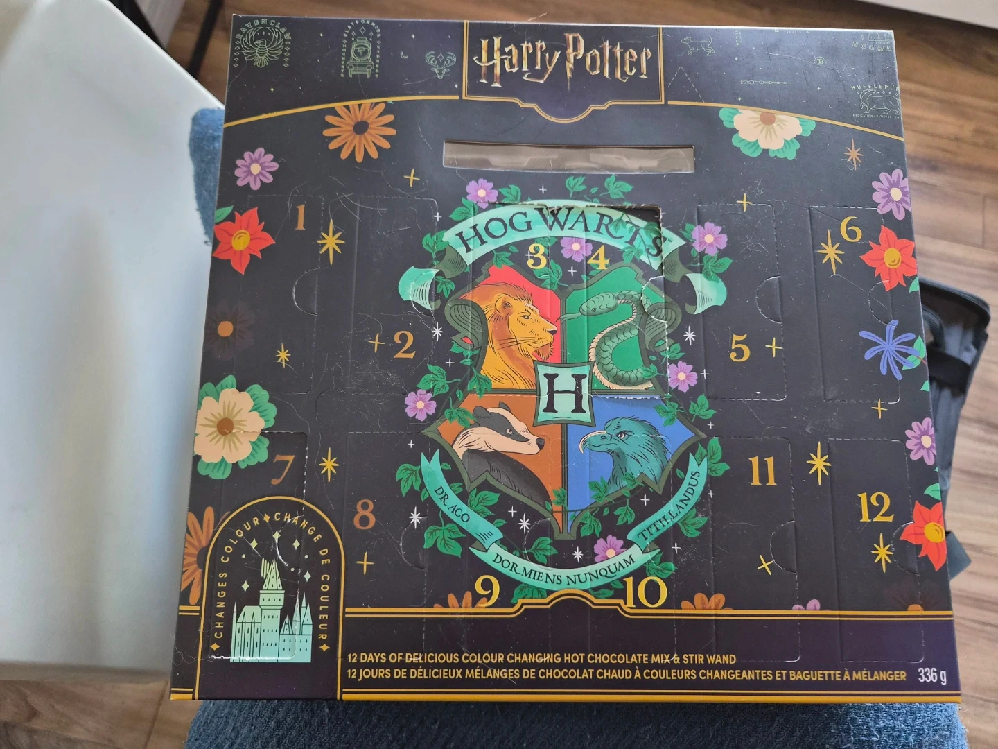This is a Harry Potter themed advent calendar with 12 days of colour changing hot chocolate mix and a stir wand. It contains 336g of product. Unopened but sat on by our cat.