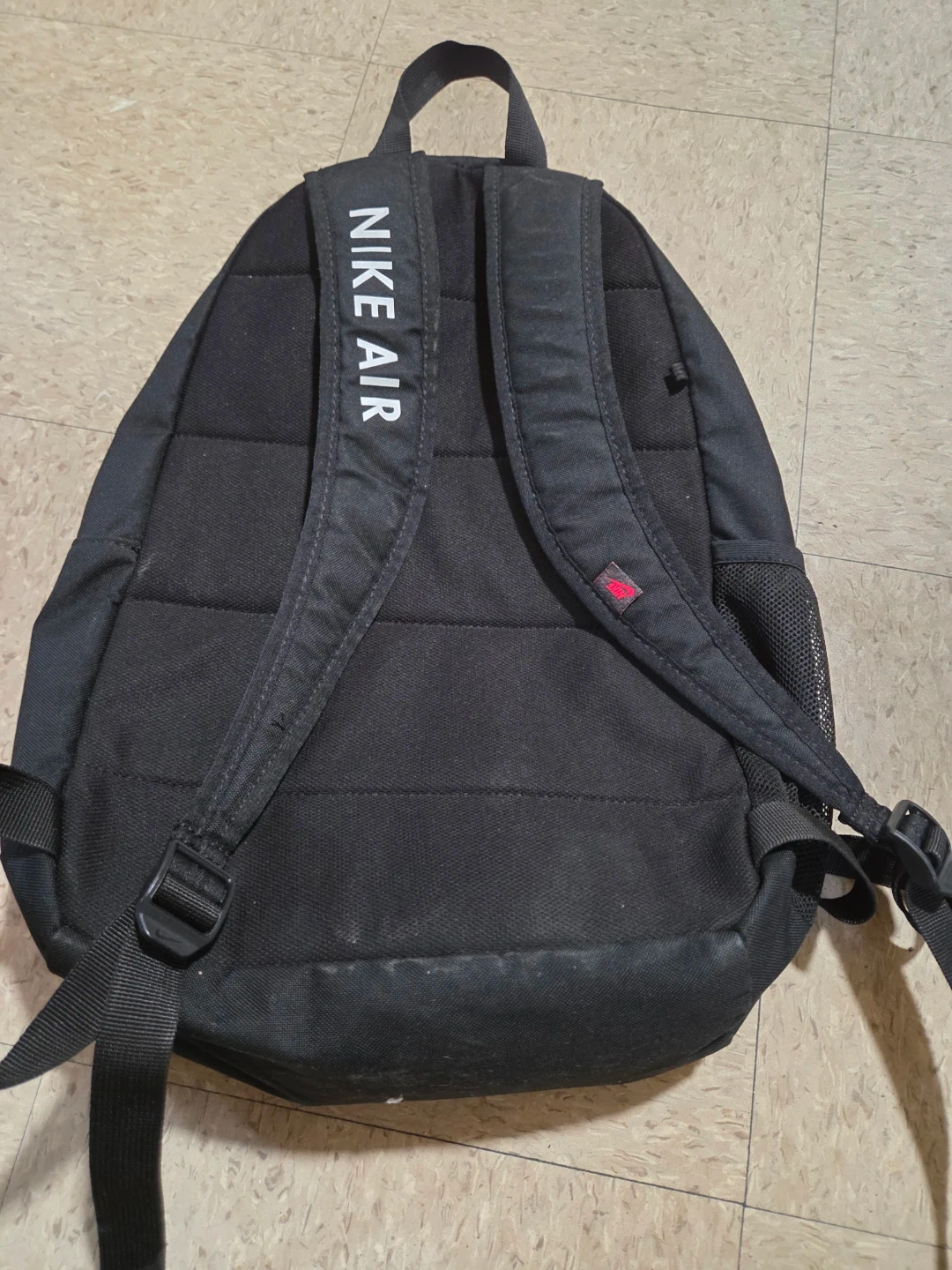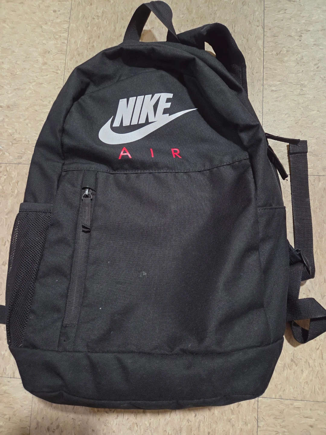 Black Nike Air backpack. It has a mesh side pocket and a zippered main compartment. Padded shoulder straps for comfort.