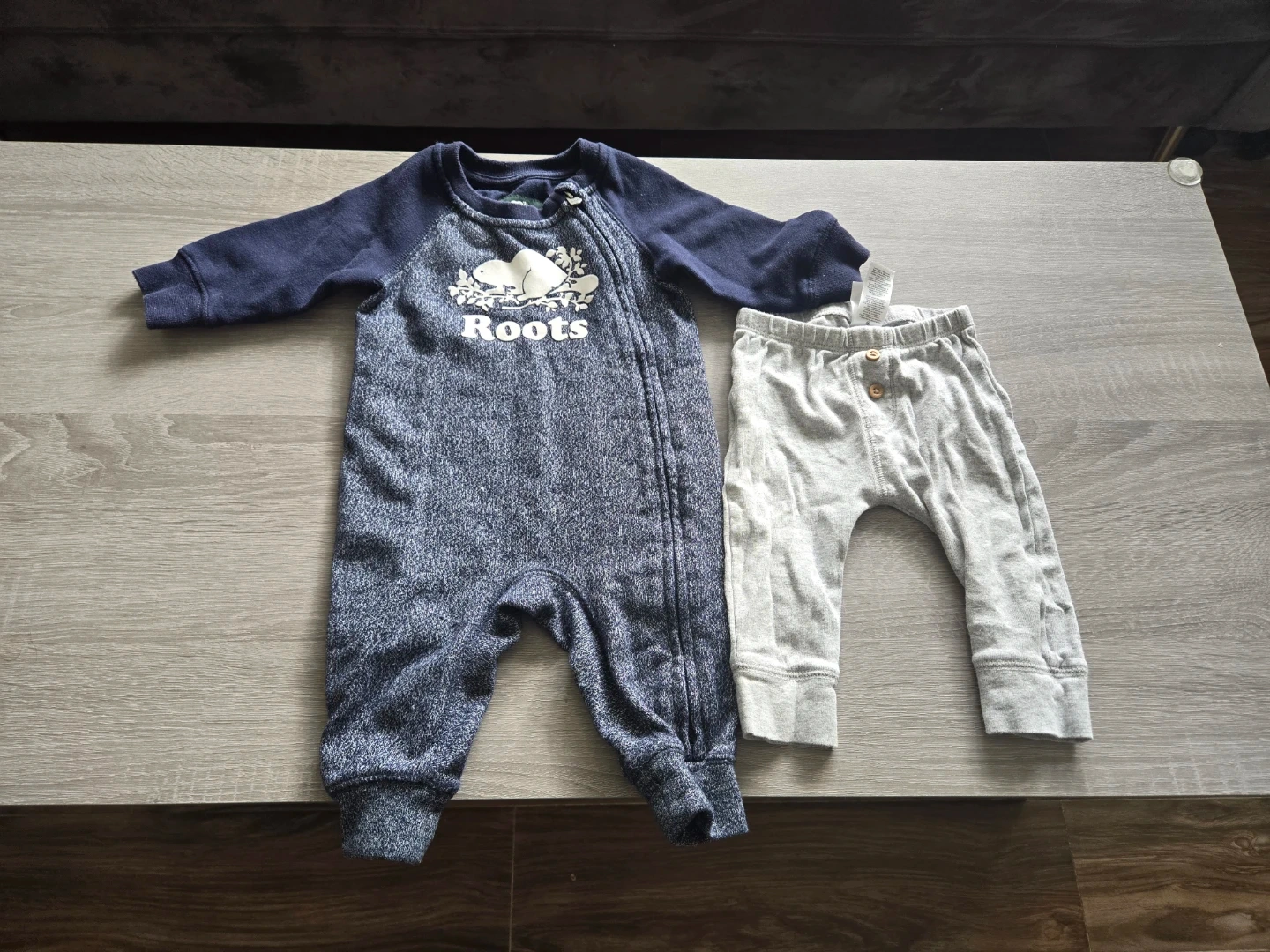 The navy blue onesie featuring the Roots logo and a zip closure has a bleach stain on the back as shown in the photo. The grey pants have a comfortable elastic waistband.