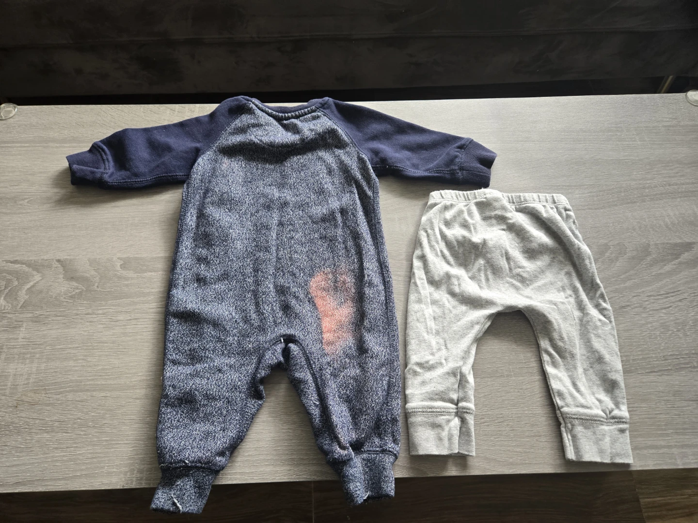 The navy blue onesie featuring the Roots logo and a zip closure has a bleach stain on the back as shown in the photo. The grey pants have a comfortable elastic waistband.