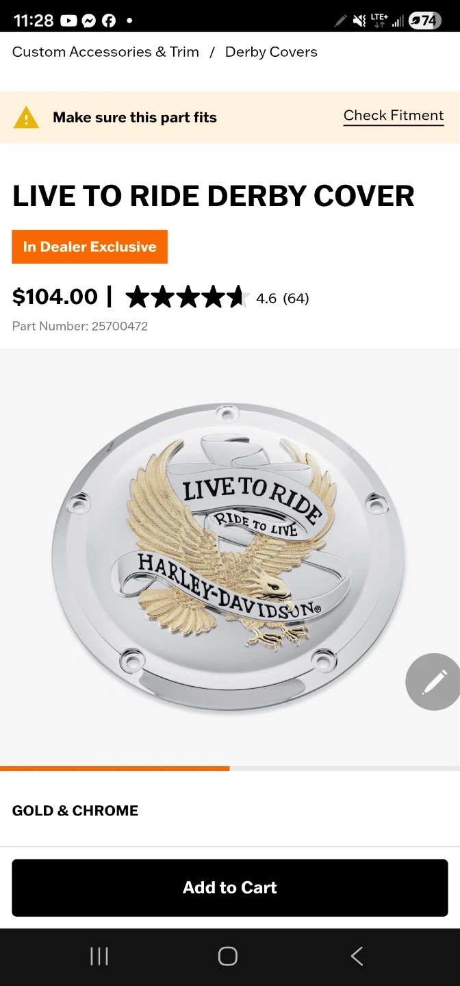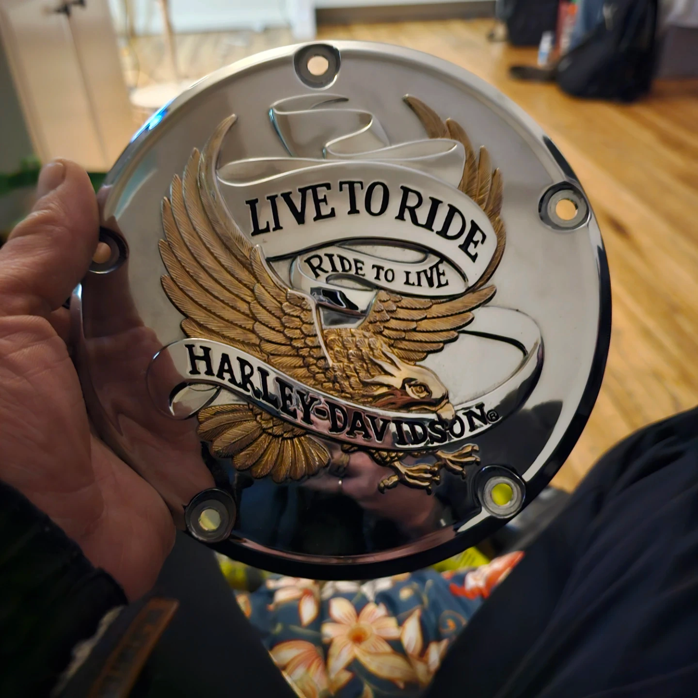 Chrome and gold "Live to Ride" derby cover for Harley-Davidson motorcycles. Features the iconic eagle and banner design. This decorative cover is a great way to personalize your ride!