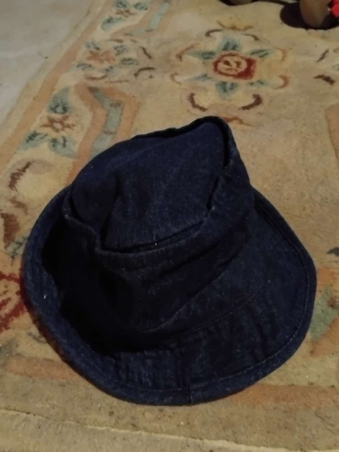 A dark wash denim bucket hat with a comfortable white lining. It's a classic style that offers sun protection. This hat is suitable for casual wear outdoors.