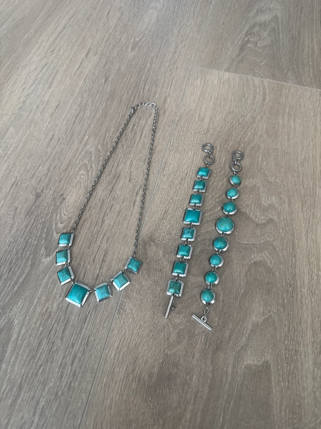 Turquoise beaded necklace and bracelet set. Features square and round turquoise-coloured stones set in a silver-toned metal. The bracelet has a toggle clasp closure. They are never worn and selling since im a student. I do discounts on bundles!!