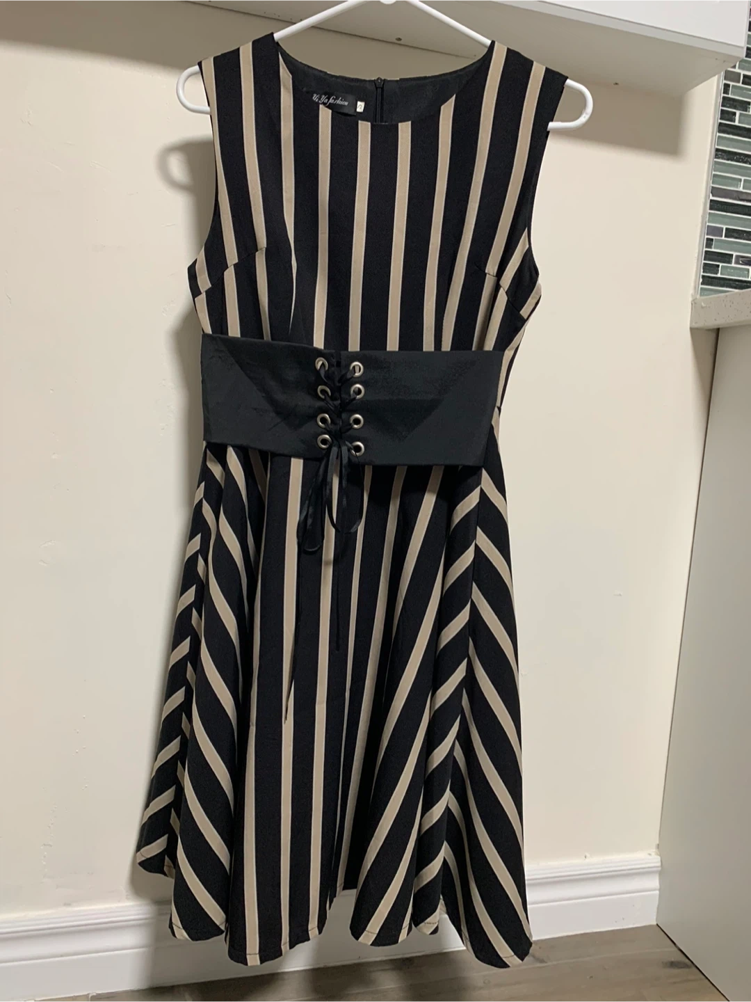 Selling a cute dress featuring a stylish striped pattern and a corset-style belt. Perfect for a casual day out or a special occasion. Worn only twice. size XS