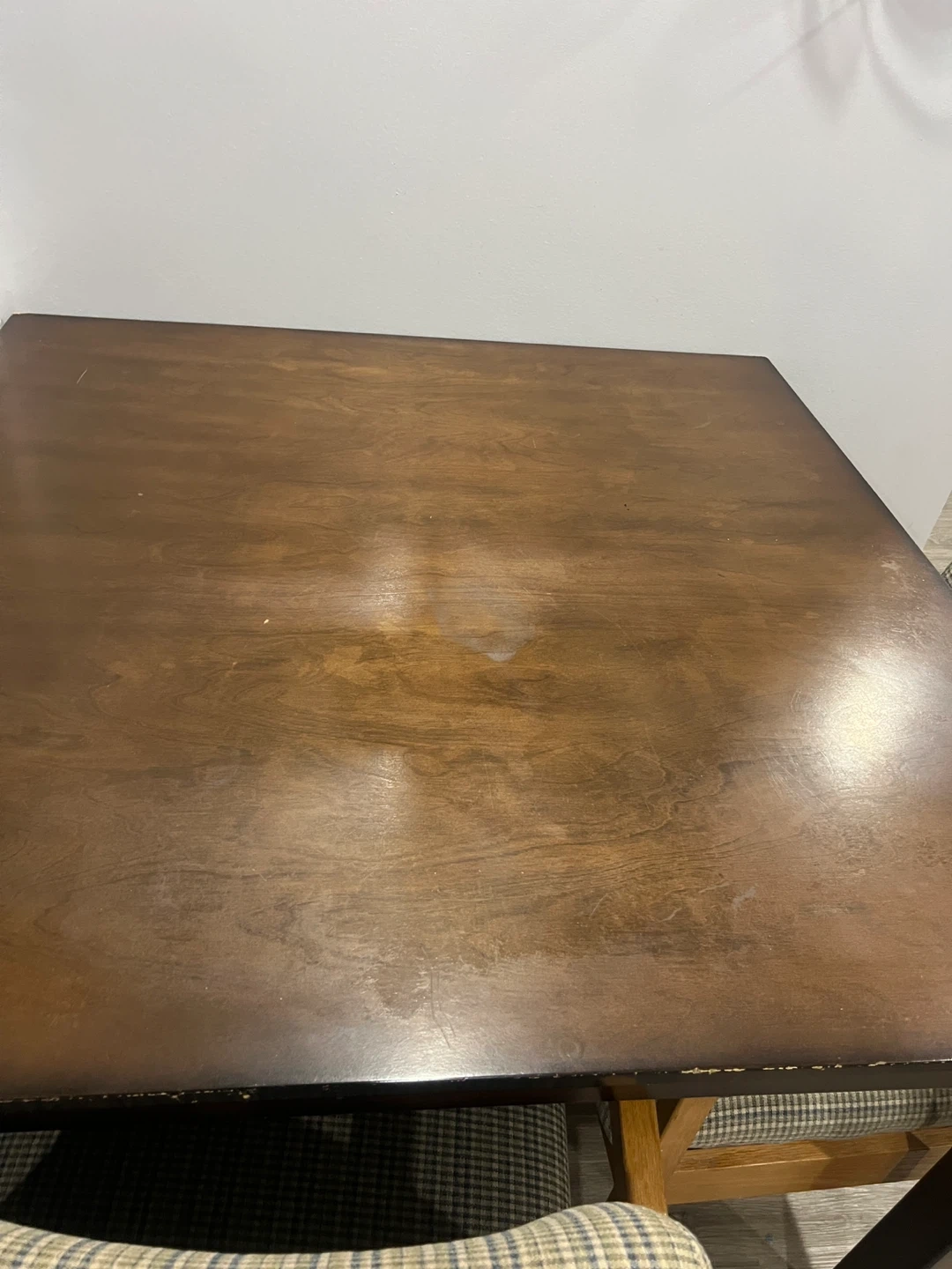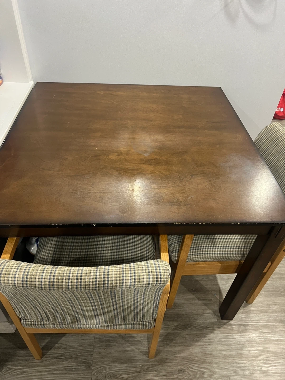 Dark wood dining table with checkered upholstered chairs. Perfect for a breakfast nook or smaller dining space. The chairs have sturdy wooden frames and comfortable seating.