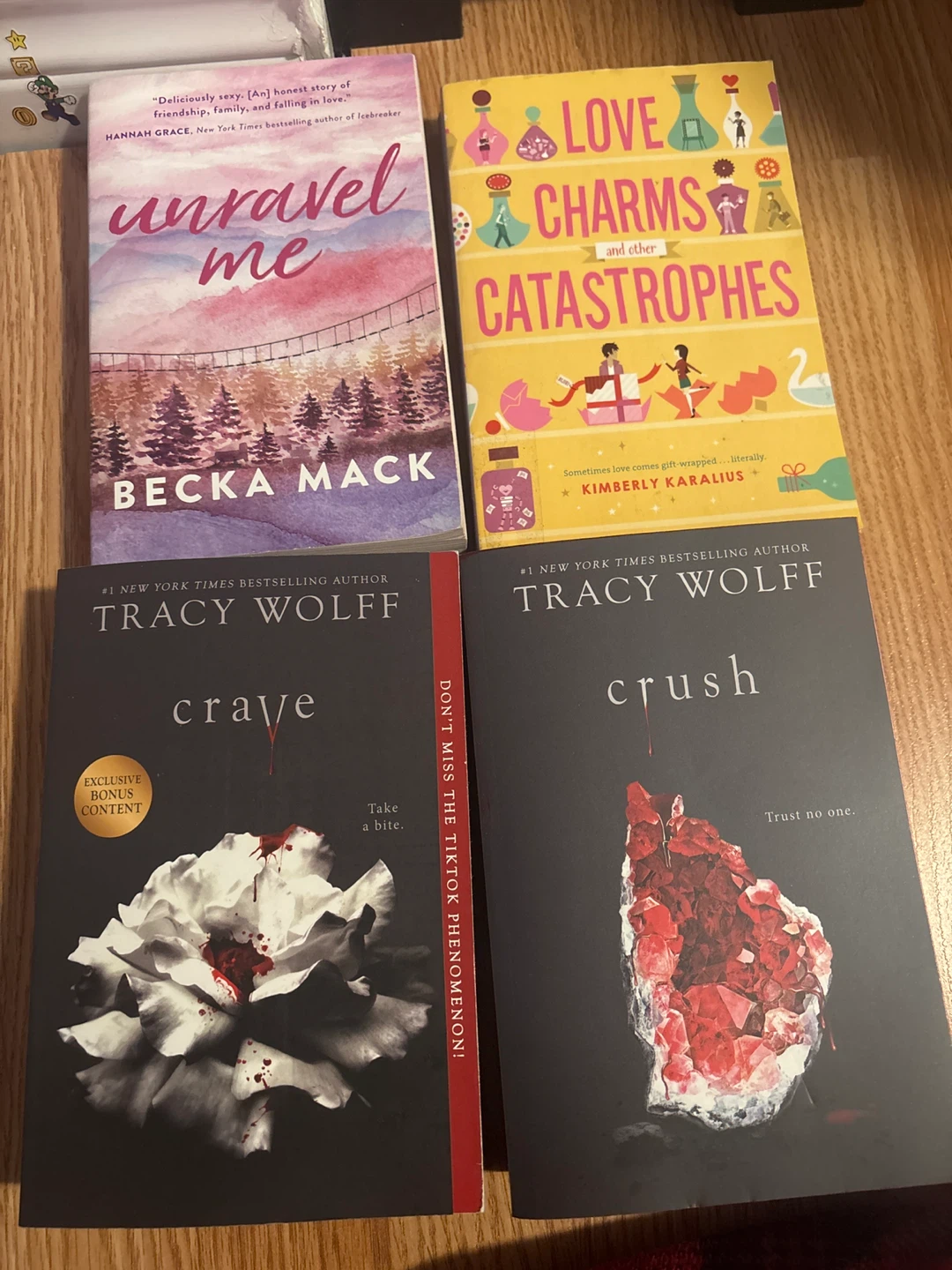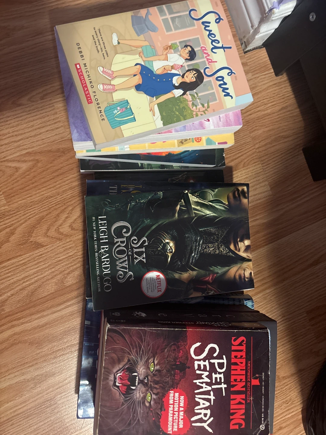 Most barely touched, kids books is the second picture, romance books the third picture, the mystery fantasy books are the last picture