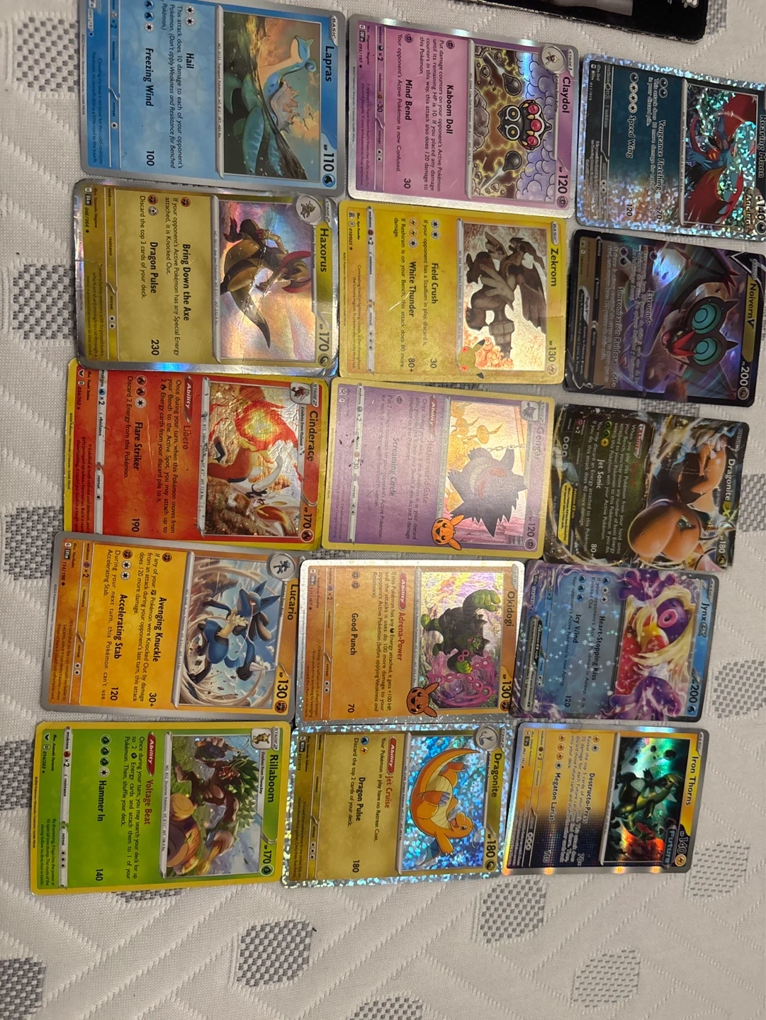 Collection of assorted Pokémon trading cards. Includes a variety of Pokémon like Lapras, Haxorus, Cinderace, Lucario, Rillaboom, Dragonite, Zekrom, and more. Cards feature different attacks and abilities.