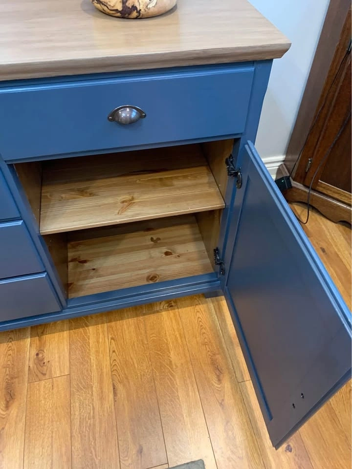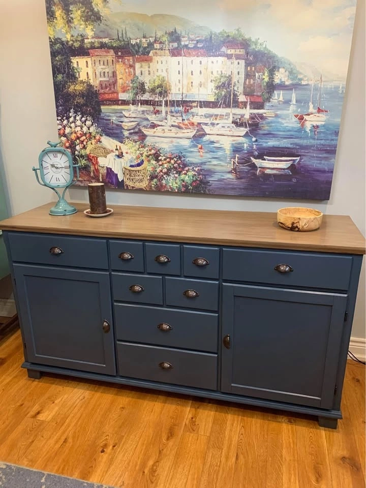 It has been thoroughly cleaned, sanded, primed and painted in a lovely custom blue. Top has been dark walnut glazed. Entire piece has been top coated for protection and durability.