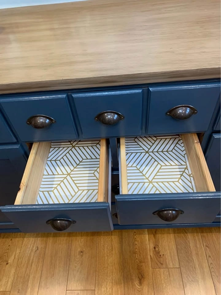 Drawers have been freshly lined in a pretty hexagon pattern.