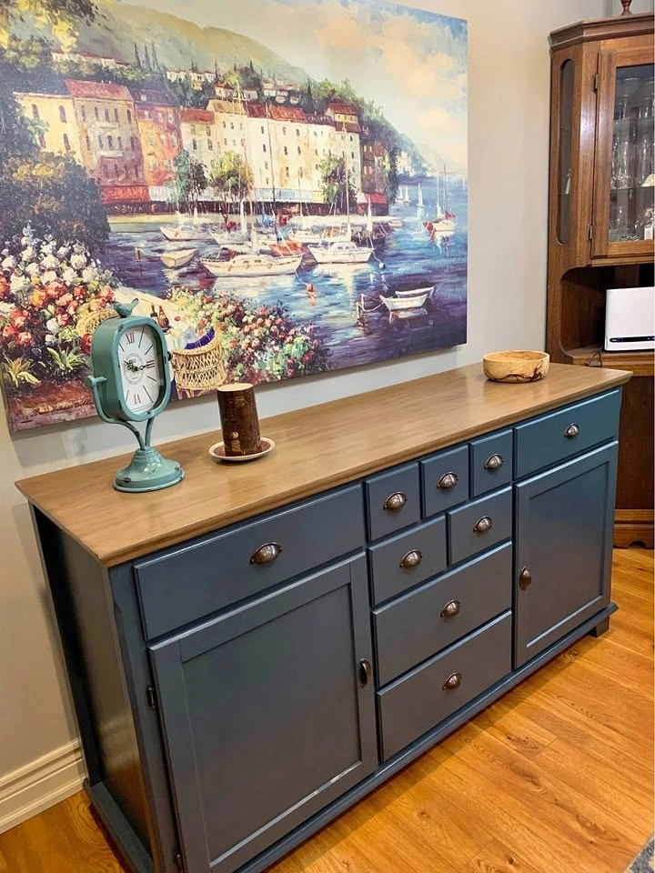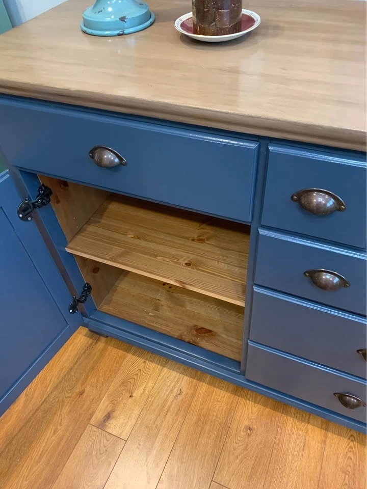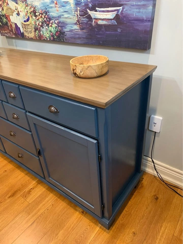 It has been thoroughly cleaned, sanded, primed and painted in a lovely custom blue. Top has been dark walnut glazed. Entire piece has been top coated for protection and durability.