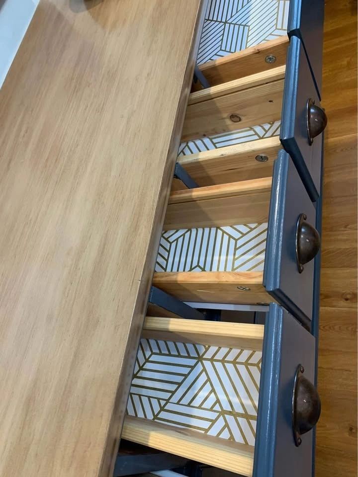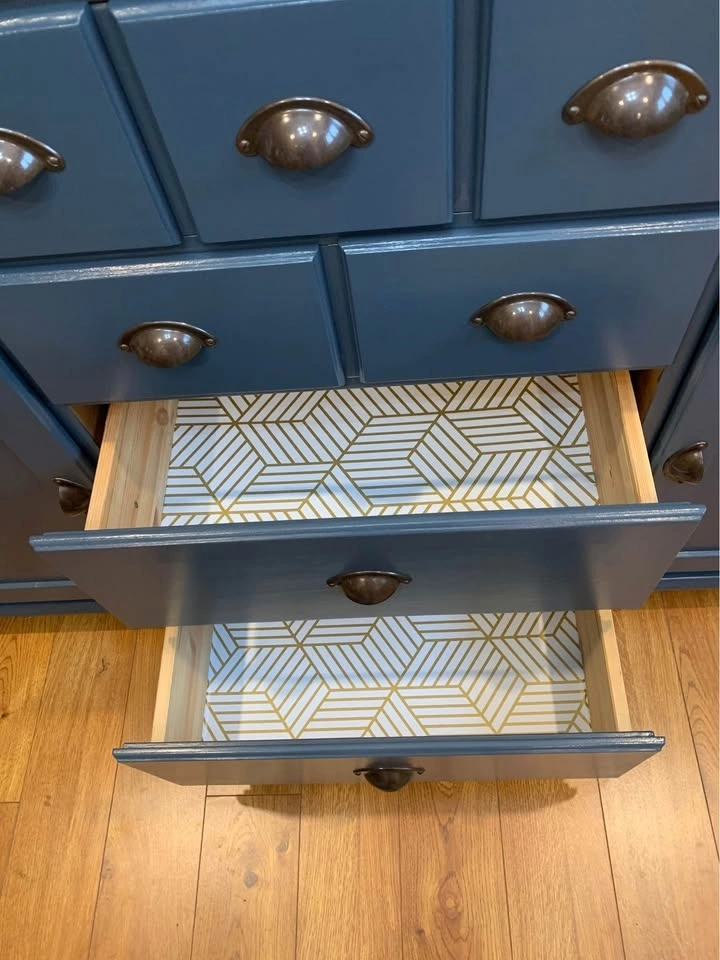 Drawers have been freshly lined in a pretty hexagon pattern.