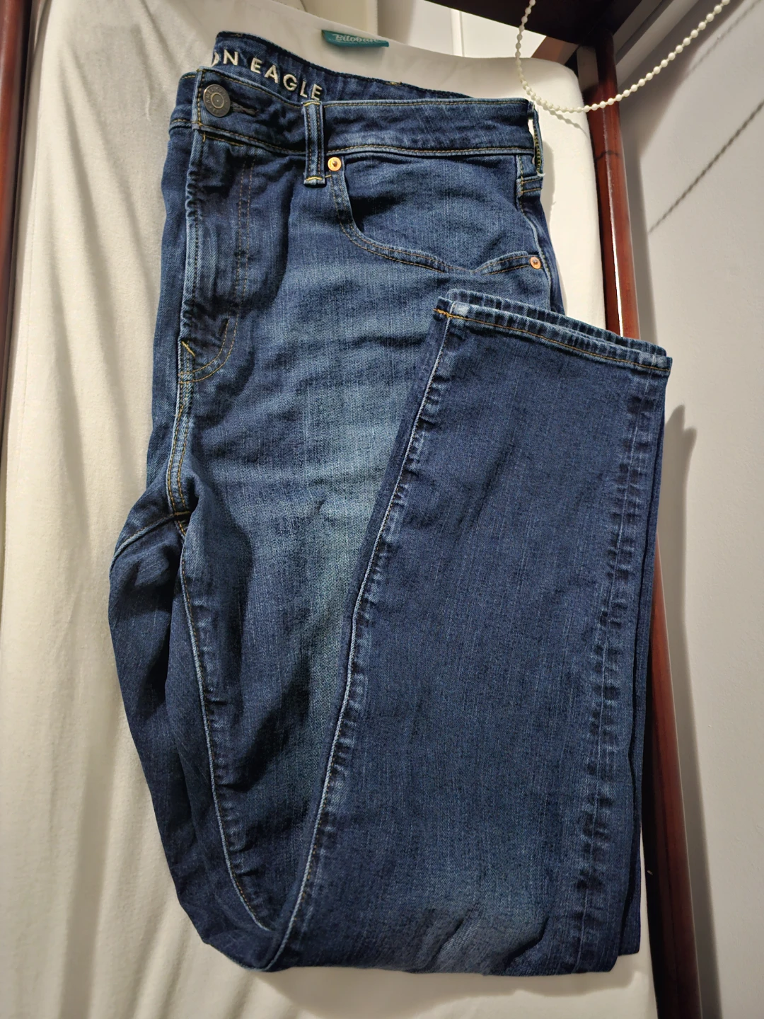 Selling a pair of American Eagle Outfitters jeans in size 38x32. They're in great shape and ready for a new owner! The material is 76% cotton, 13% recycled cotton, 10% polyester, and 1% elastane.