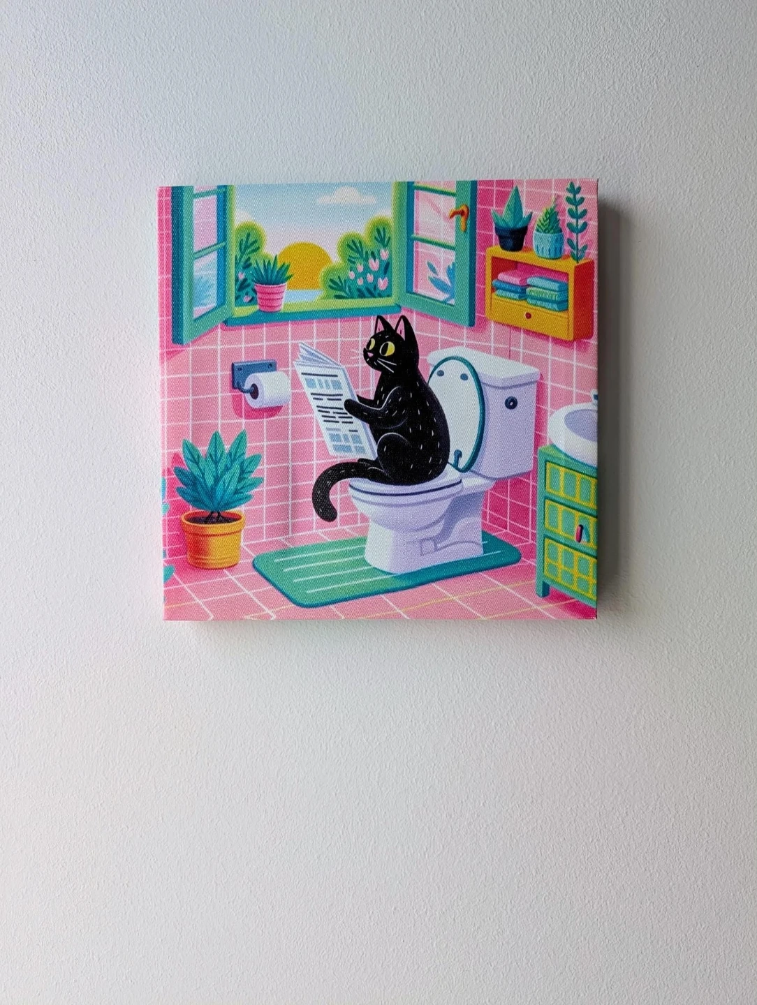Fun canvas print featuring a black cat relaxing on the toilet and reading a newspaper. It's a colourful piece with a bathroom scene and a sunset view. Great for adding a touch of humour to your home decor!