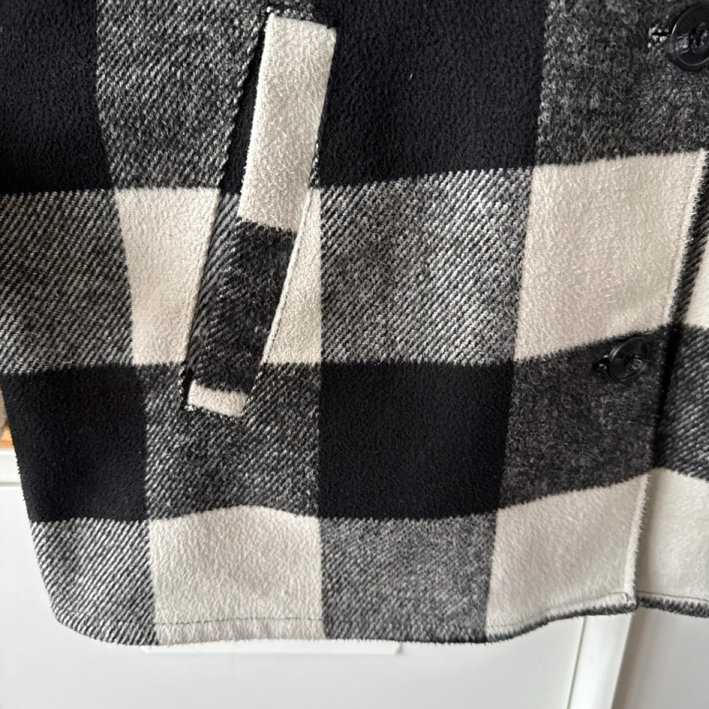 A cozy and warm shacket with a classic black and white plaid pattern. It features two chest pockets and two side pockets. Made of soft material, it's a great layering piece for cooler weather. Has a scoop back to keep your bottom warm