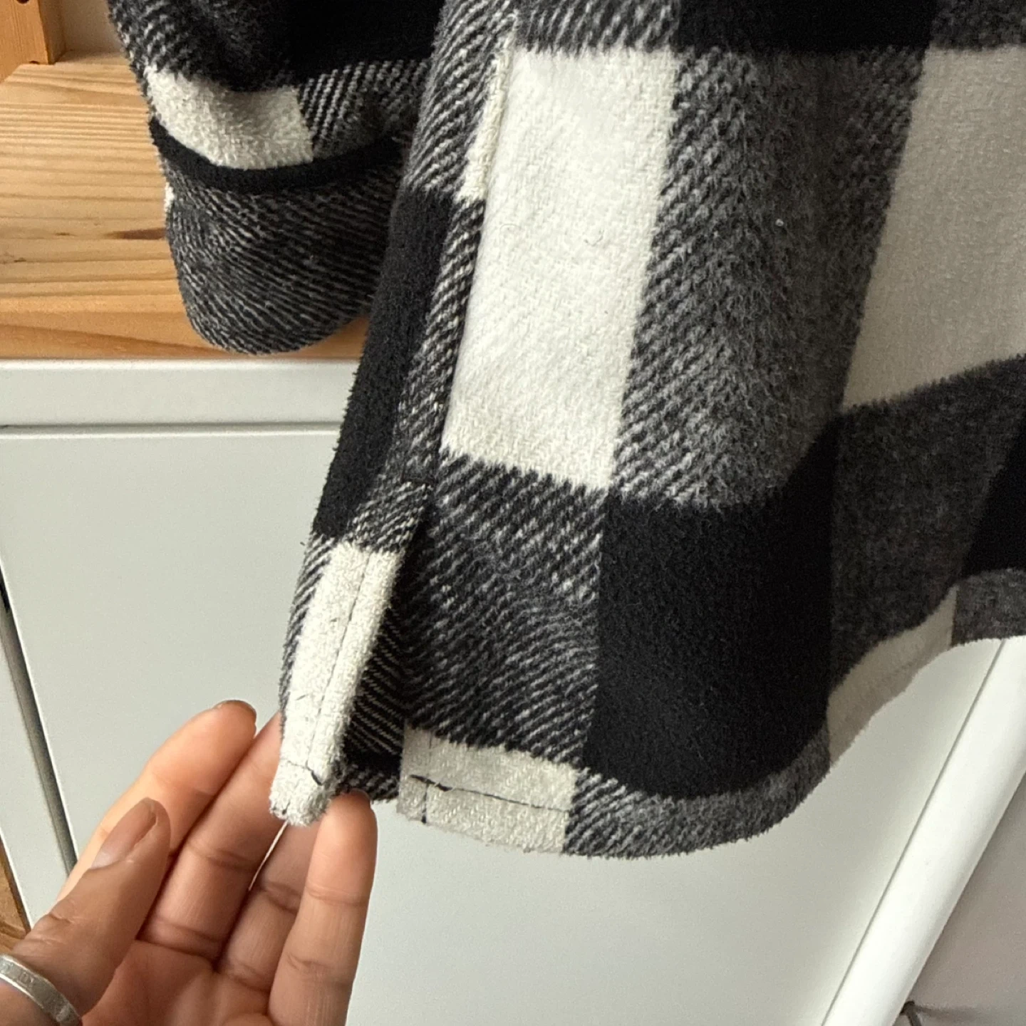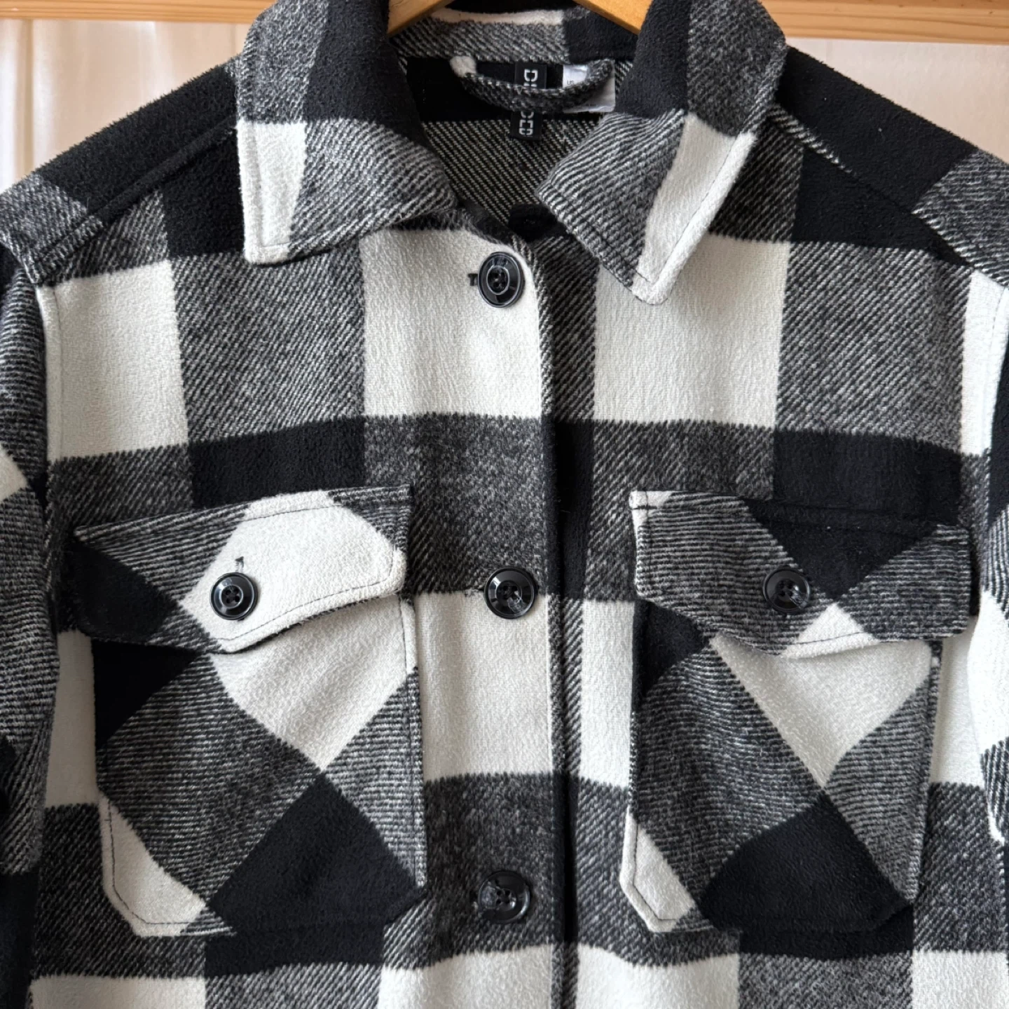 A cozy and warm shacket with a classic black and white plaid pattern. It features two chest pockets and two side pockets. Made of soft material, it's a great layering piece for cooler weather. Has a scoop back to keep your bottom warm