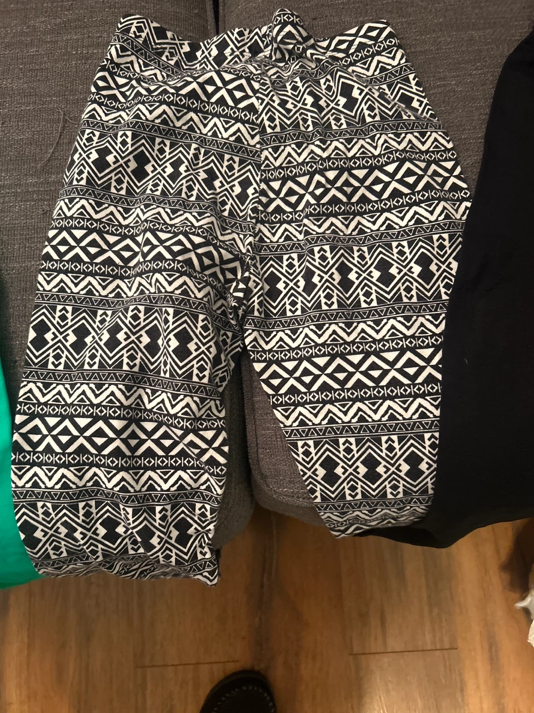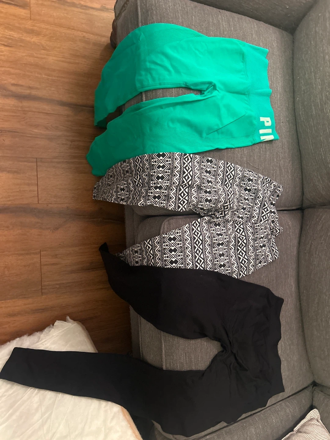Bundle includes a pair of bright green "PINK" brand athletic shorts, black patterned leggings, and plain black leggings. Great for workouts or casual wear! New