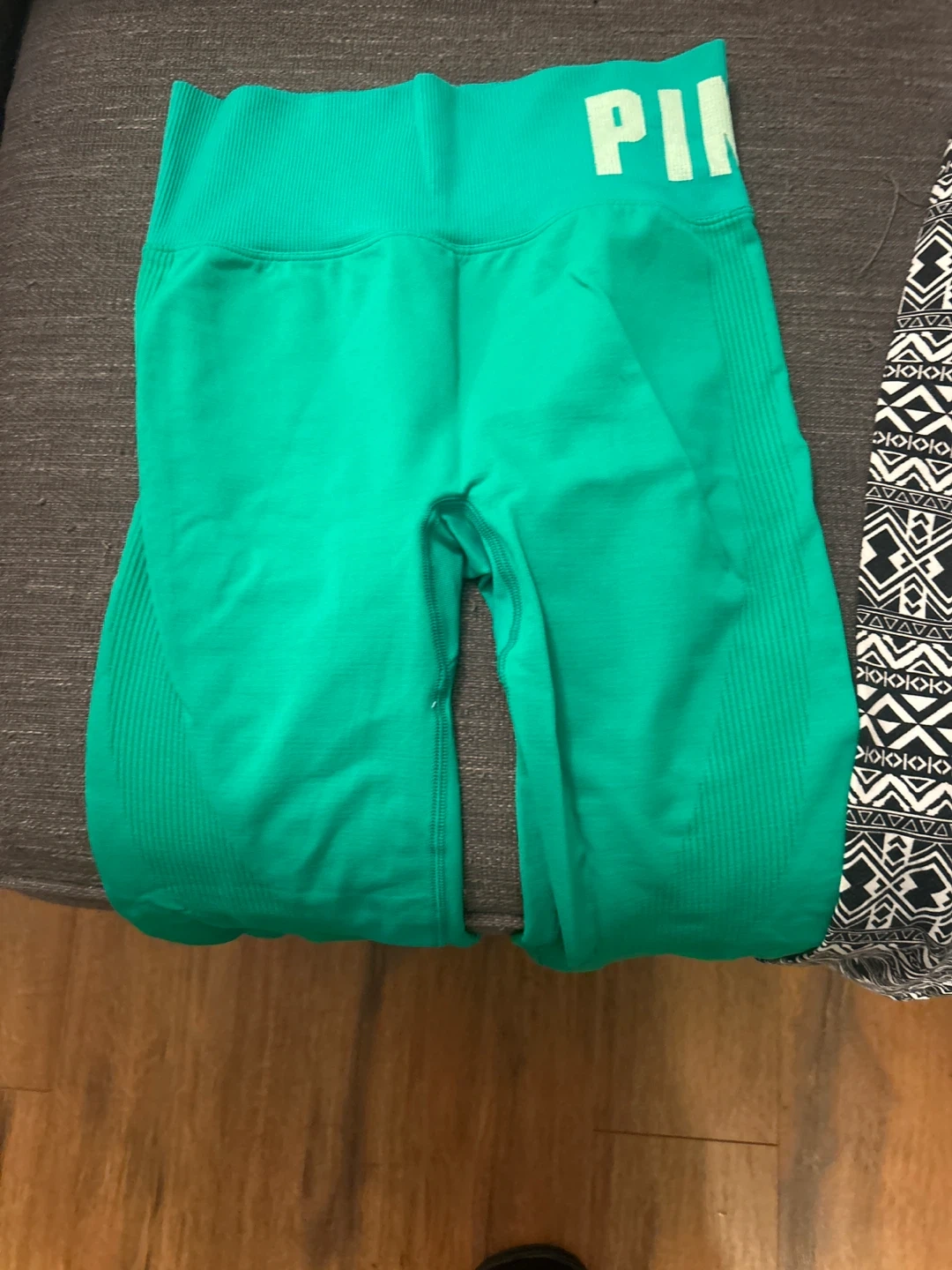 Bundle includes a pair of bright green "PINK" brand athletic shorts, black patterned leggings, and plain black leggings. Great for workouts or casual wear! New