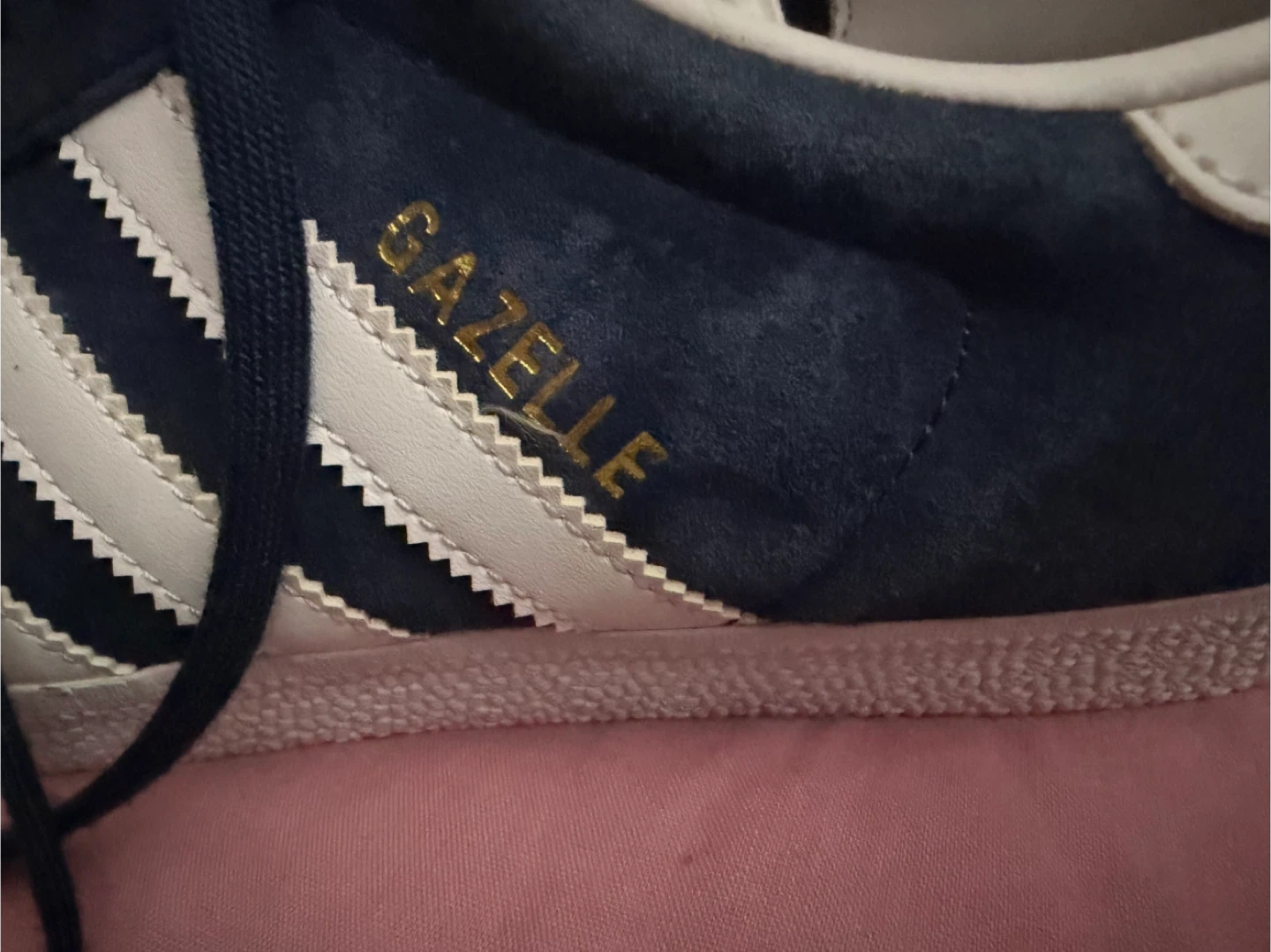 Classic Adidas Gazelle sneakers in a deep navy blue suede. These shoes feature the iconic three stripes and come with an extra pair of white laces. A timeless style for everyday wear!