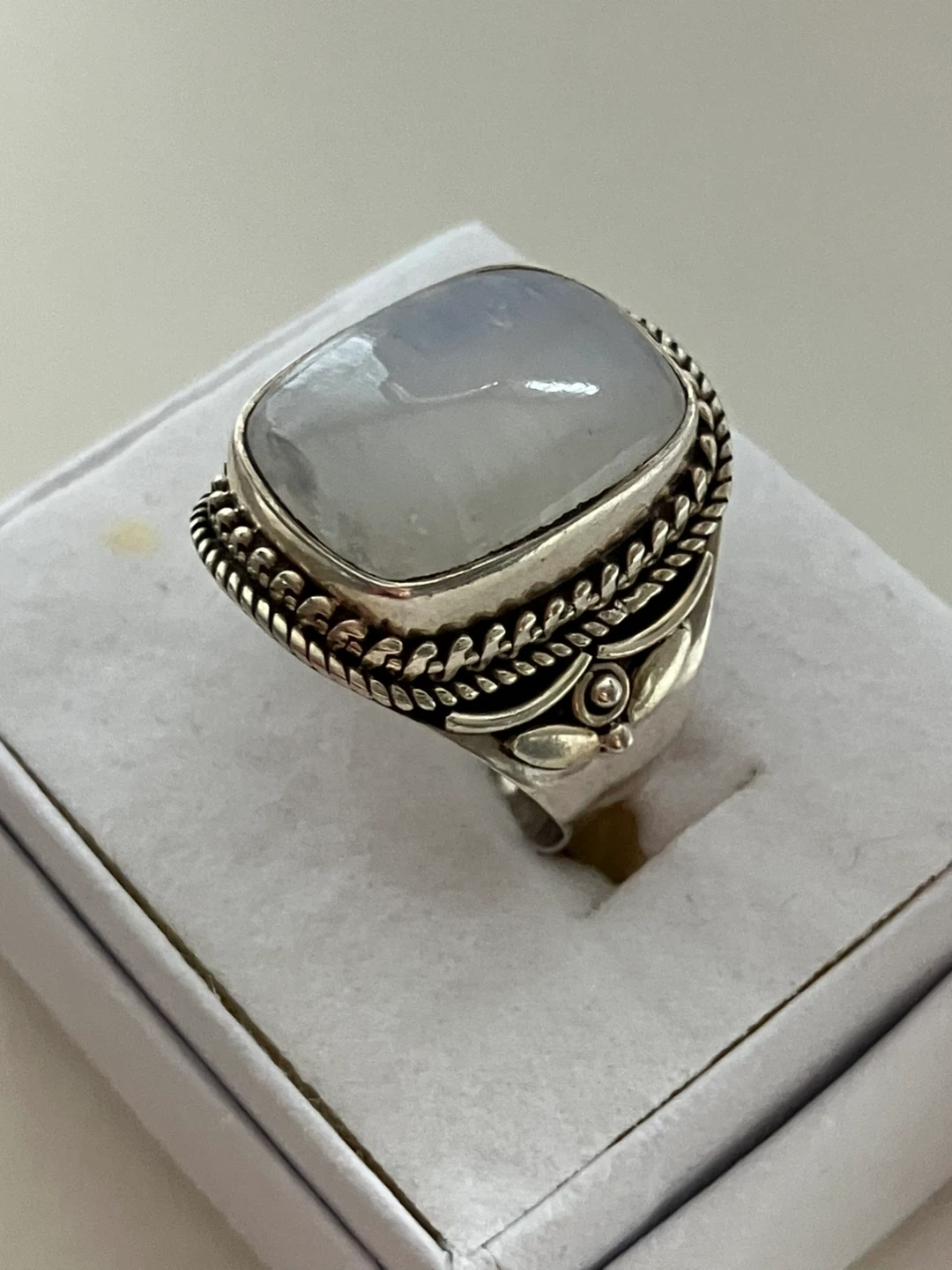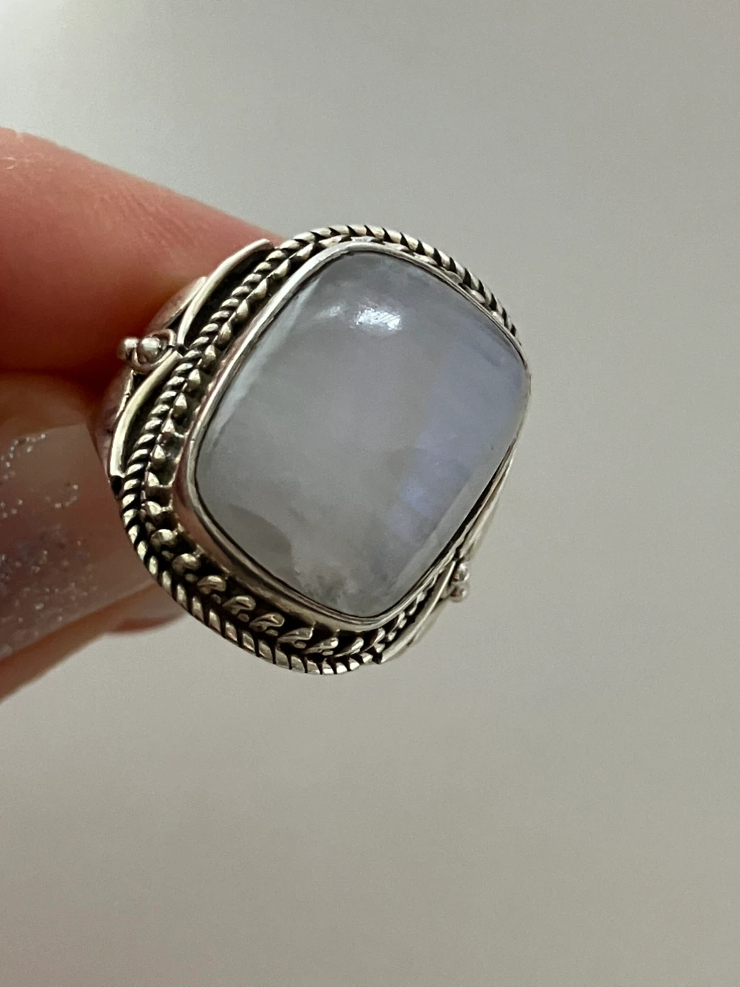 Pretty silver ring with a light blue moonstone. It's stamped 925 for sterling silver. The band has intricate detailing.