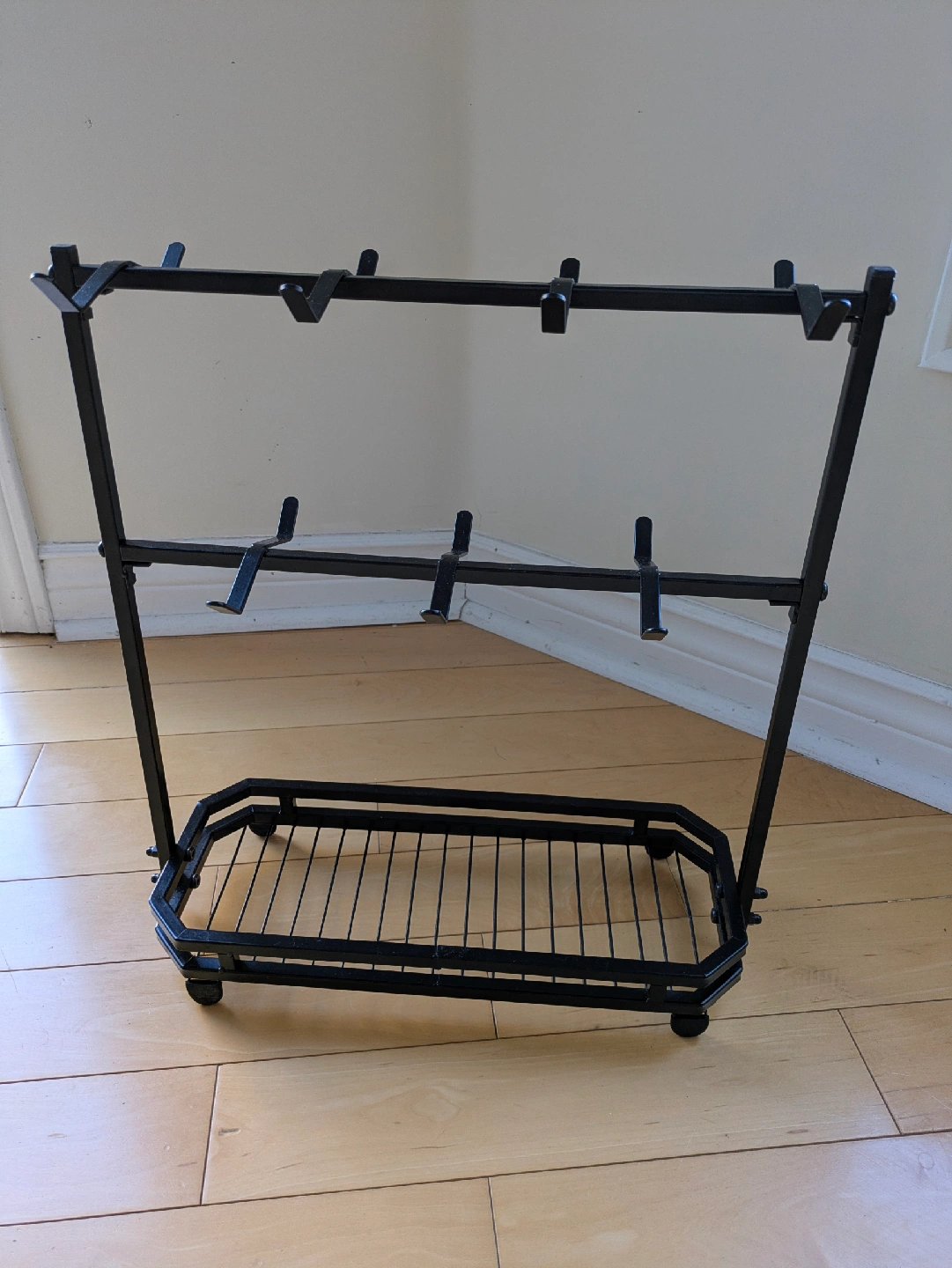 Selling a black metal mug rack. It's in great shape and ready to hold your mugs! It also has a bottom rack for tea bags, sugar, etc.