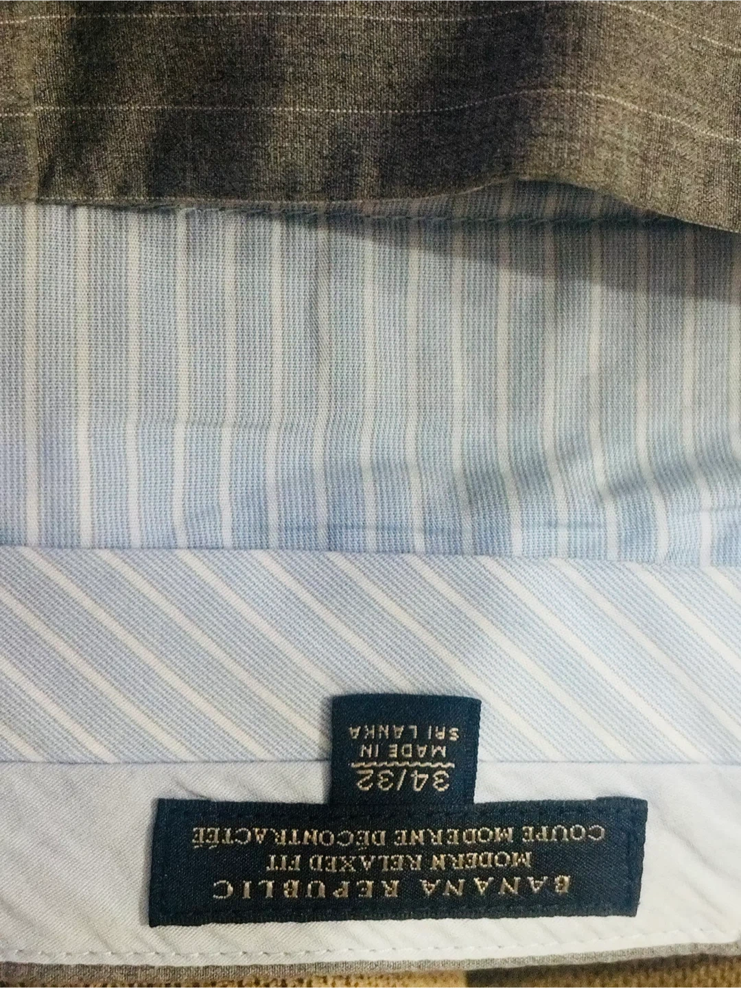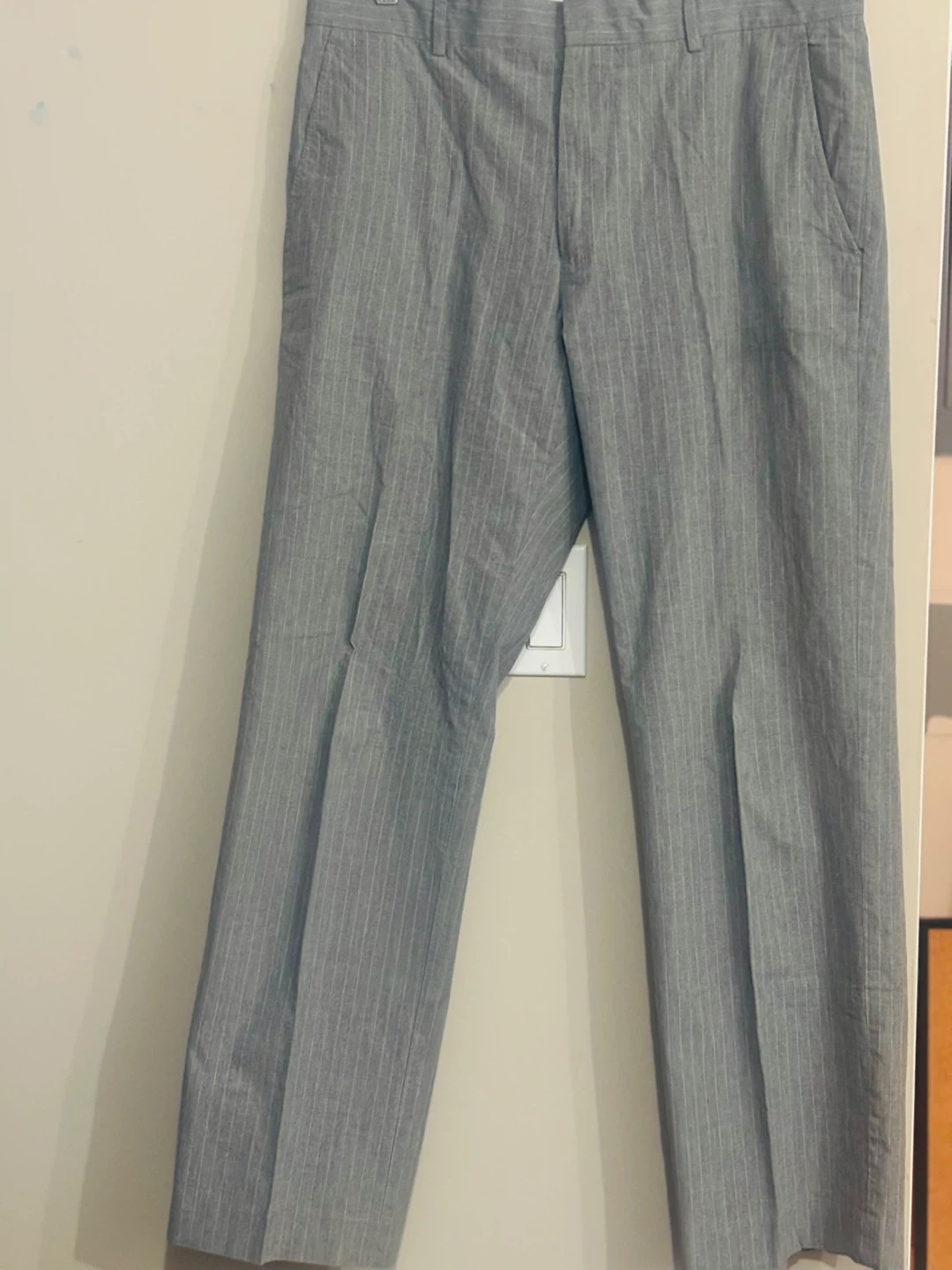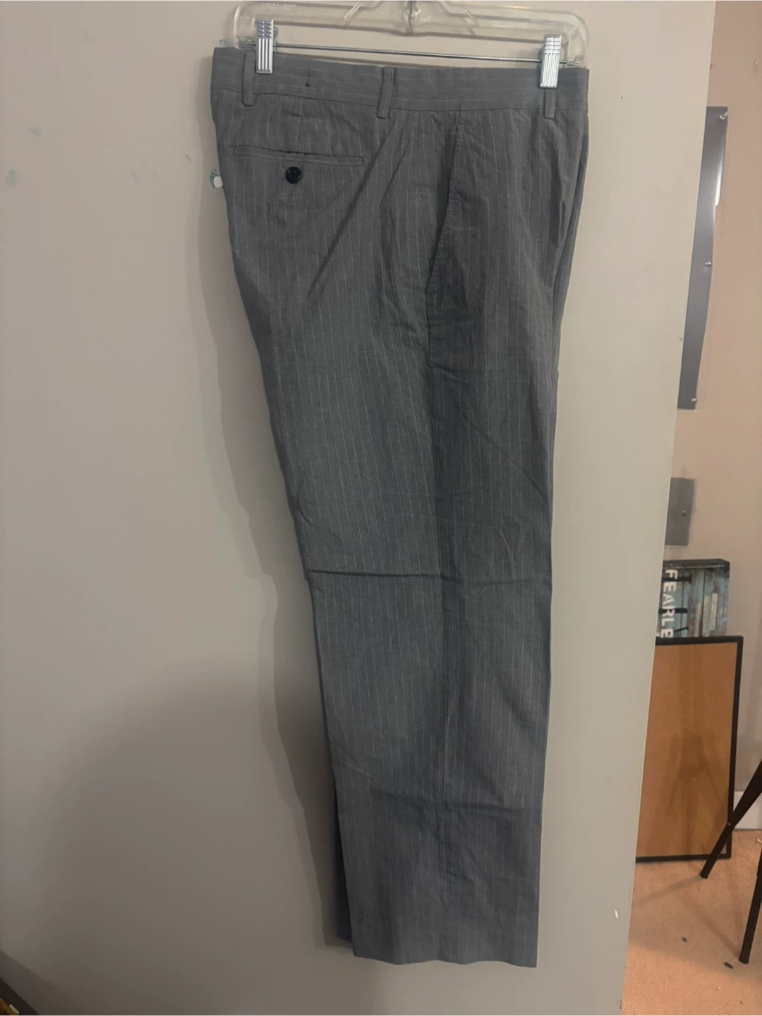 Grey pinstripe trousers from Banana Republic. Modern relaxed fit, size 34/32. Made of 100% cotton. These would be great for business casual wear. Pick up in Terwillegar