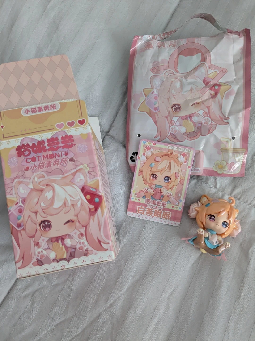 Selling a cute Cat Moni blind box figure! It comes with the box and the card. This adorable collectible is perfect for any fan of kawaii figurines