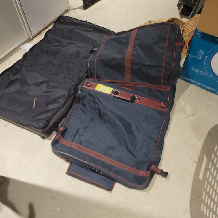 Garment bag for suits and other formal clothing. Blue nylon material with brown leather accents. Includes a zippered compartment and two carrying handles.