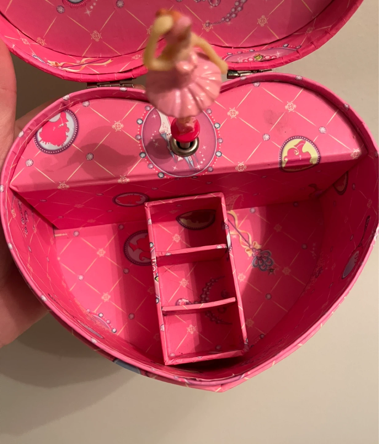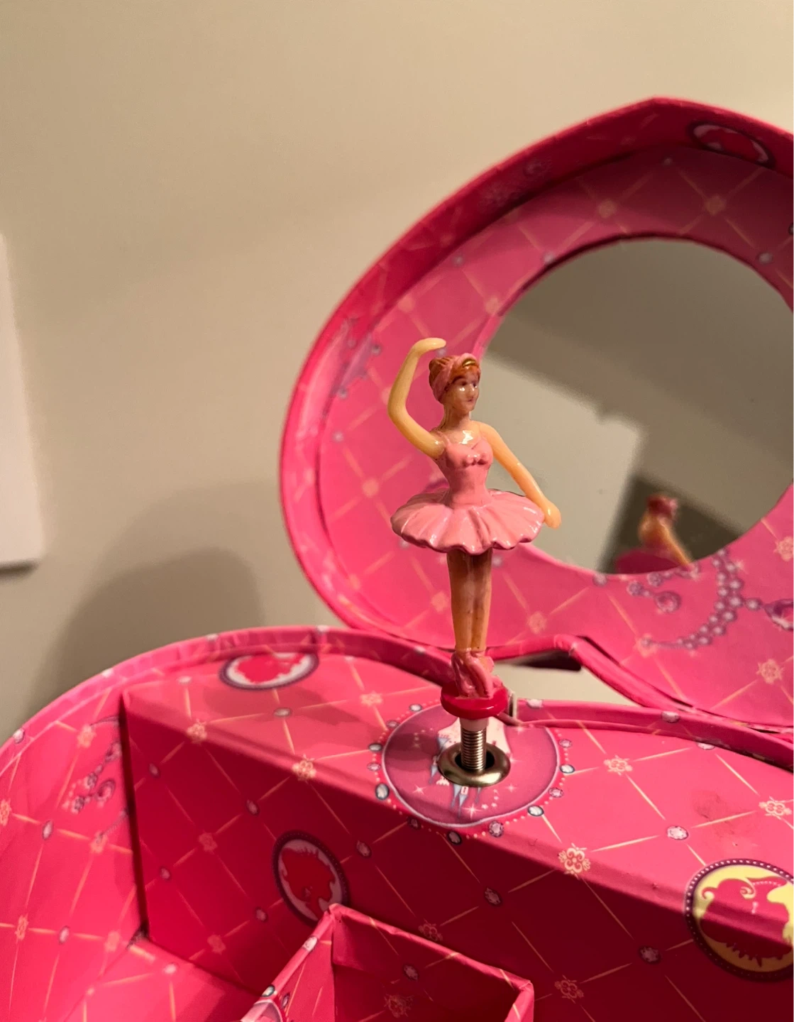 This sweet pink heart-shaped musical jewellery box features a spinning ballerina and a mirror inside. It has a winding key on the side for the music. The inside has a small compartment for trinkets. It's a lovely piece for keeping small treasures safe!