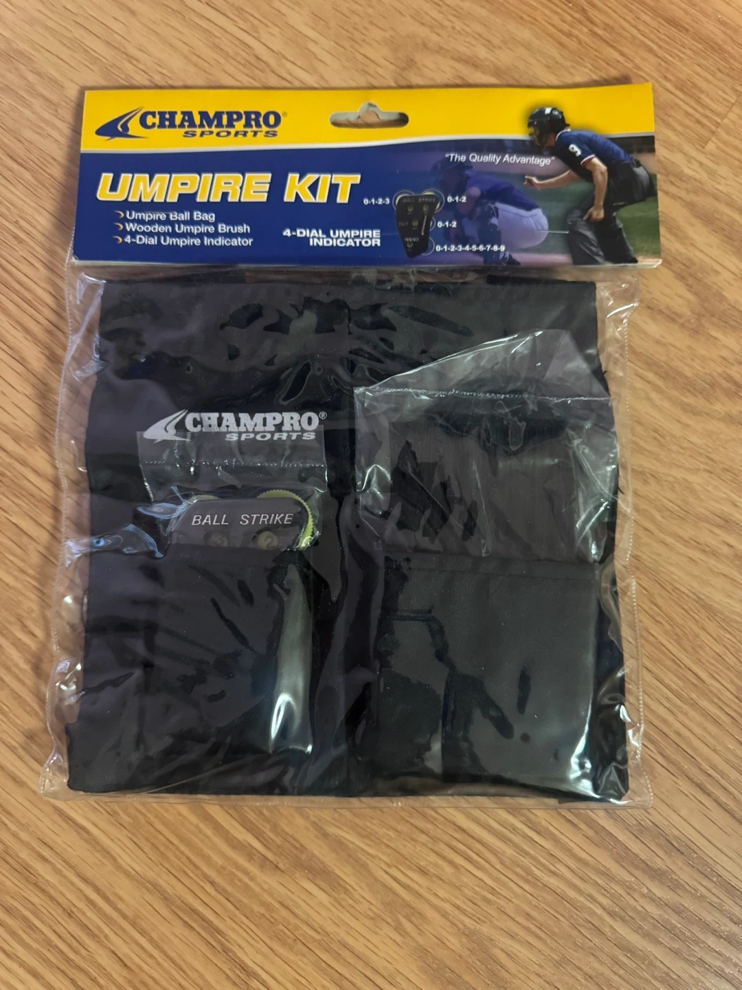 This kit includes an umpire ball bag, a wooden umpire brush, and a 4-dial umpire indicator. It's designed for umpires to keep their essential gear handy during games. Perfect for baseball or softball umpires!