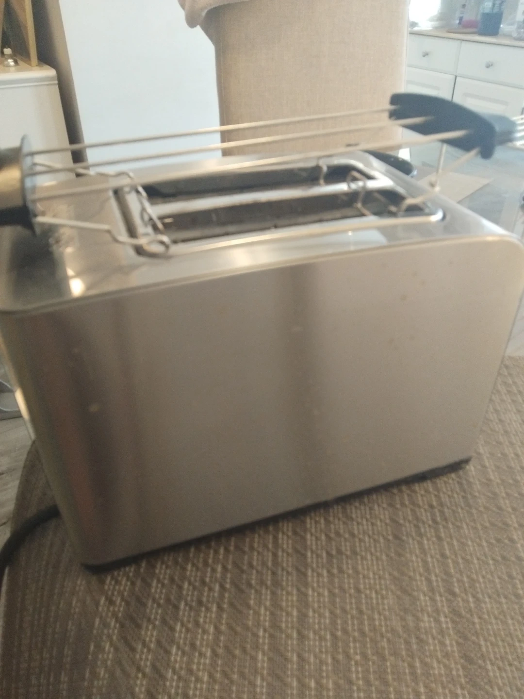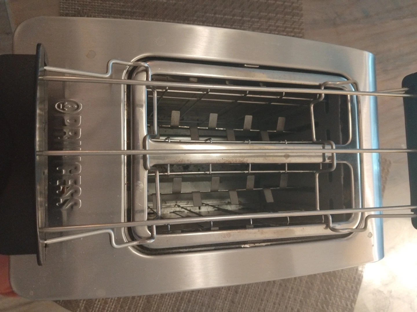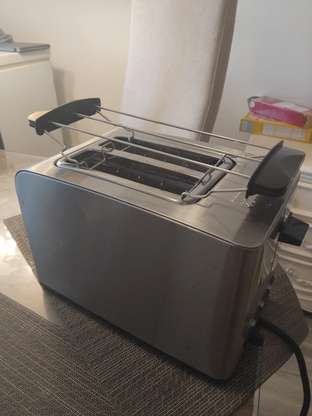 This is a silver Princess 2-slice toaster. It has multiple browning settings and a warming rack. It's made of stainless steel.