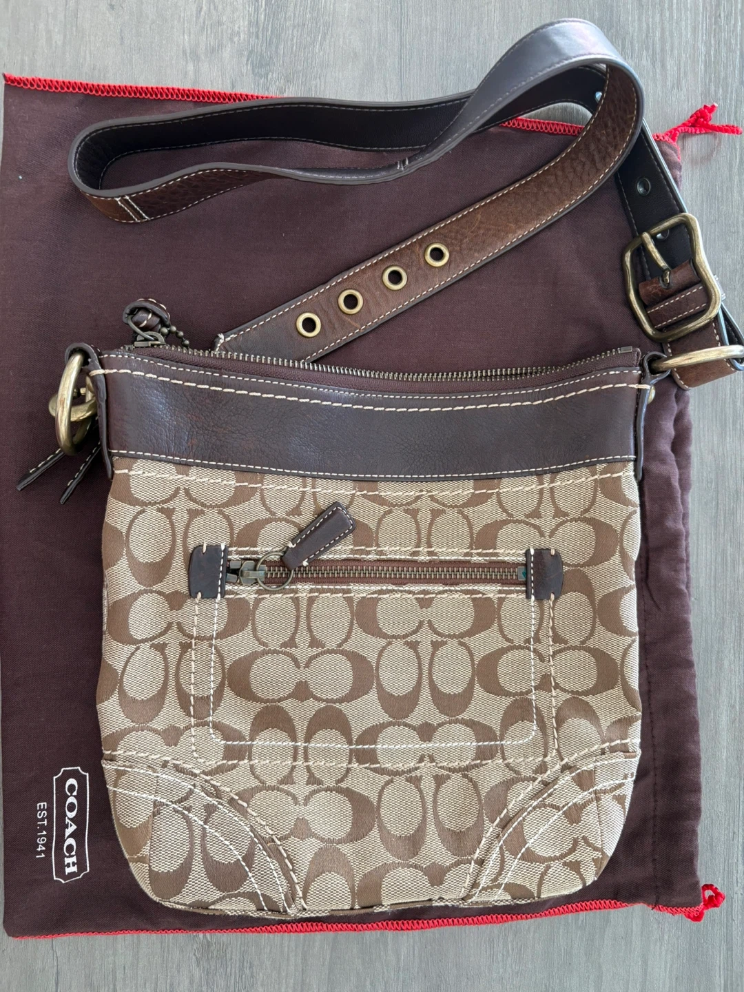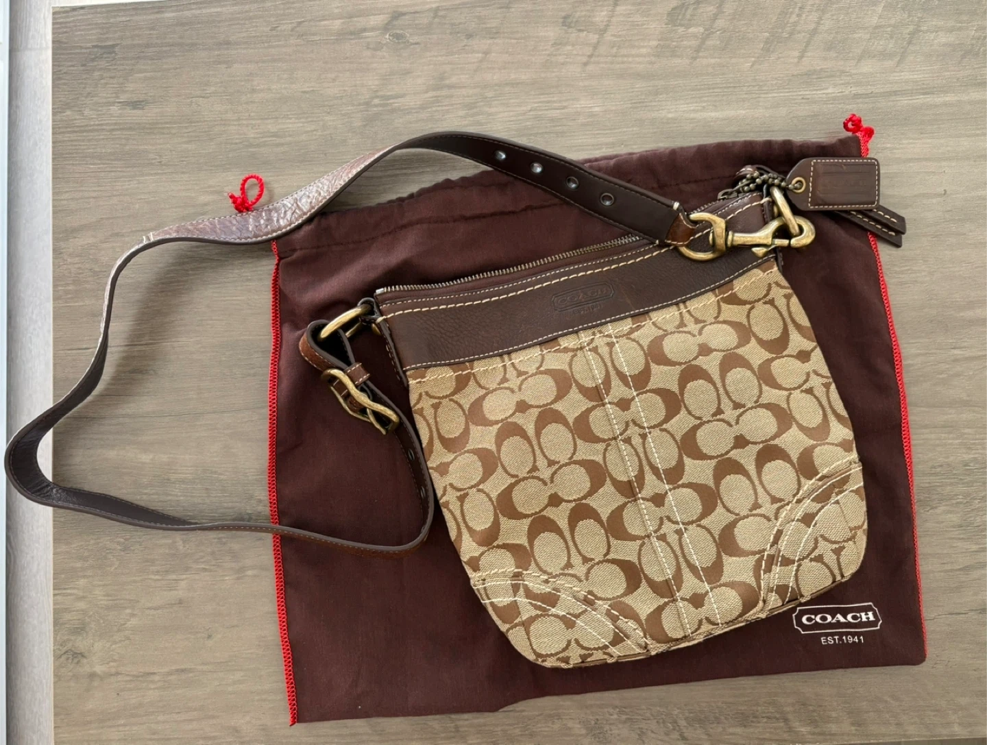 Selling a gently used Coach hobo bag! It features the classic Coach signature pattern in brown tones and leather trim. Comes with the original dust bag.