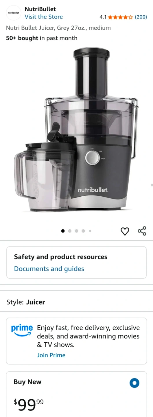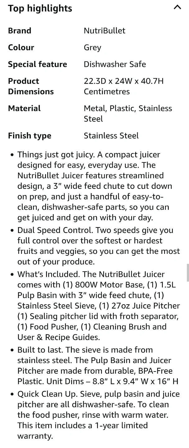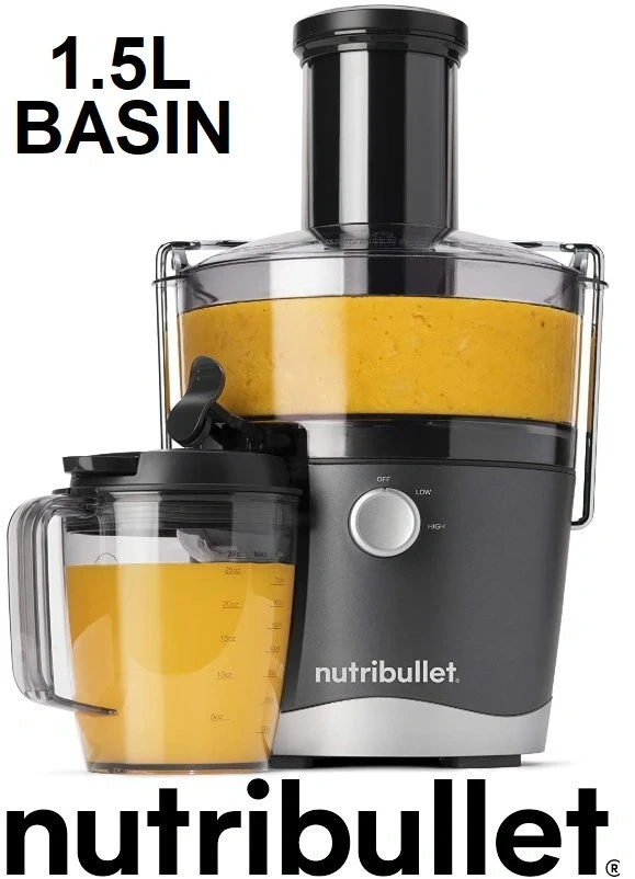 Enjoy fresh and nutritious juices with this grey NutriBullet Juicer, designed for easy and everyday use. This compact juicer features a streamlined design, a 3" wide feed chute, and dishwasher-safe parts.