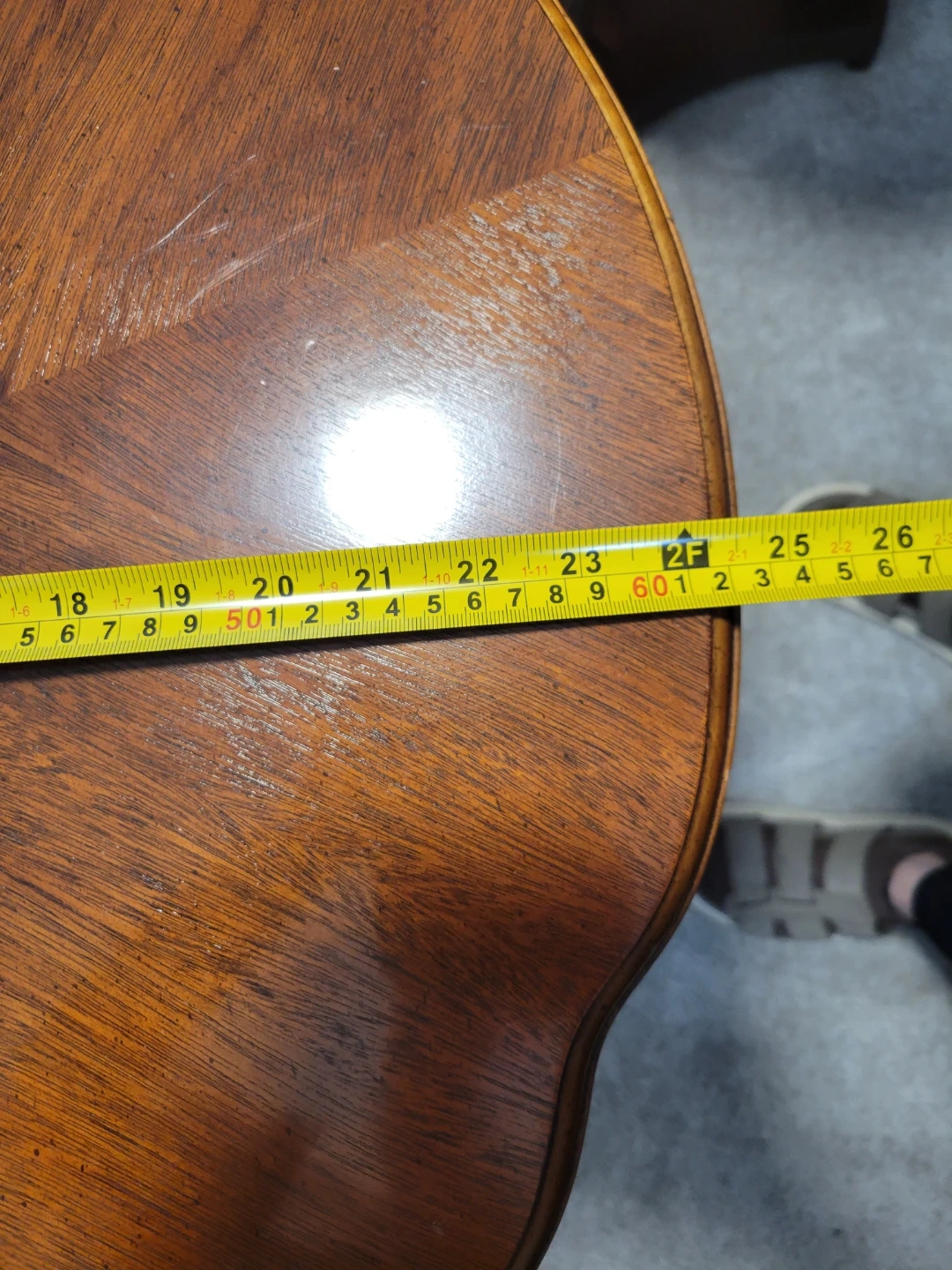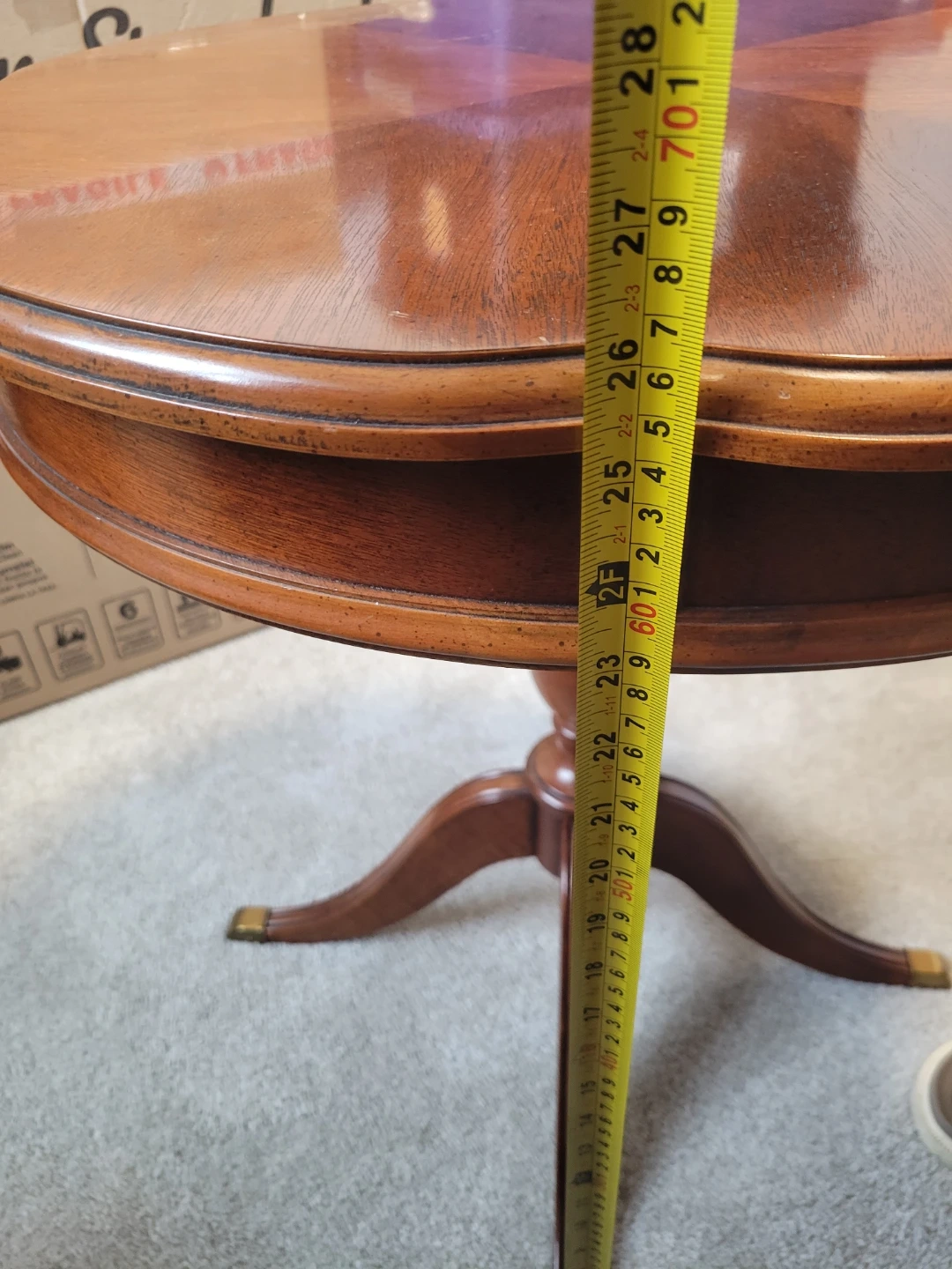 A classic wooden accent table with a beautiful wood grain finish and brass accents on the feet. It's approximately 20 inches in diameter and stands about 28 inches tall. This table would look lovely in a living room or entryway.