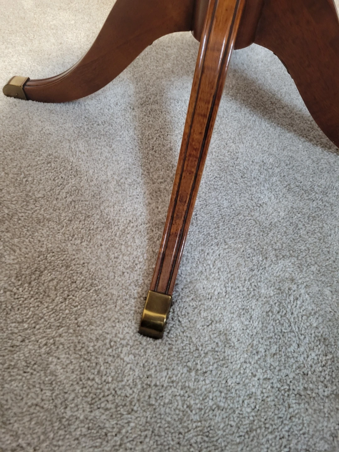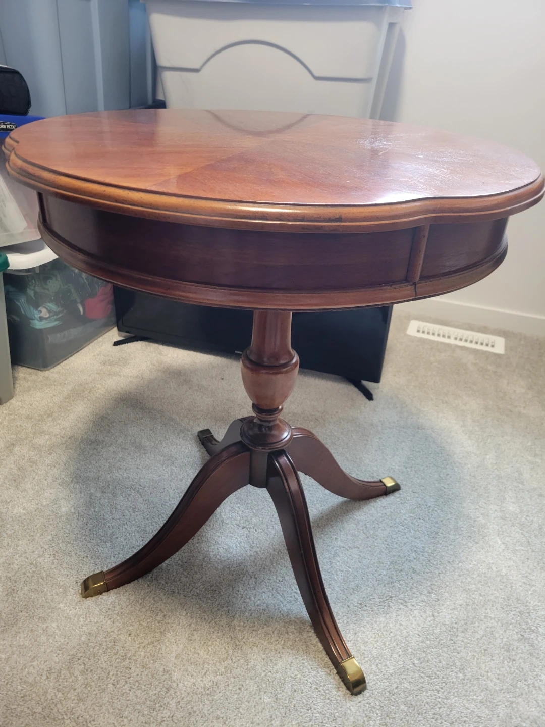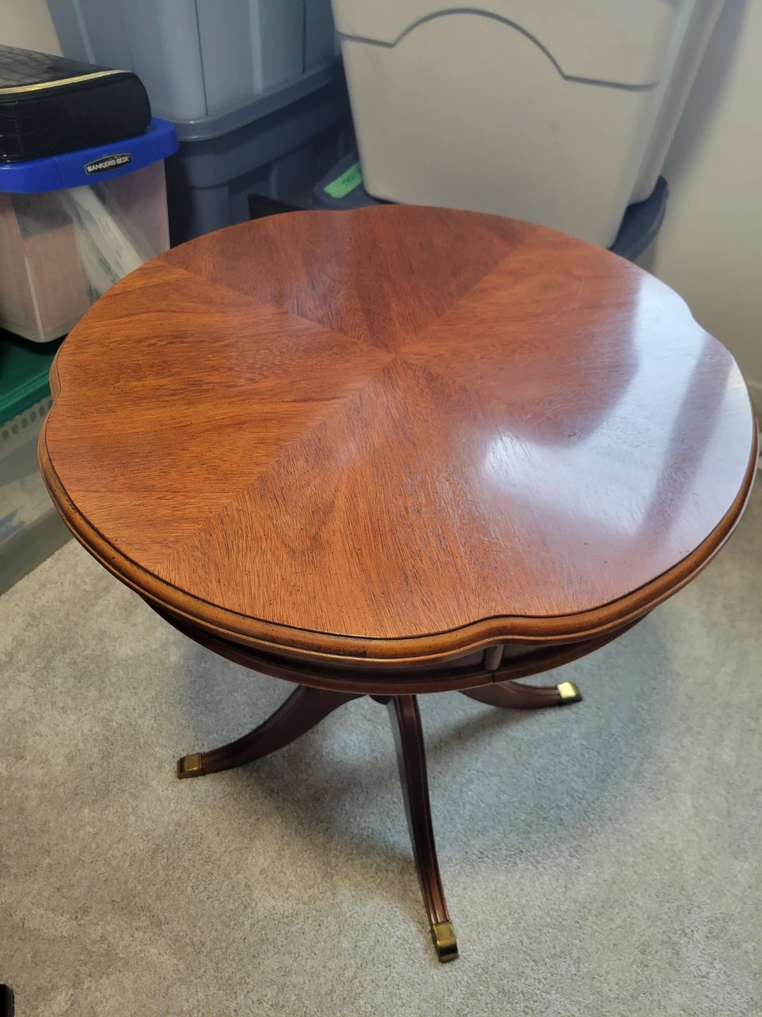 A classic wooden accent table with a beautiful wood grain finish and brass accents on the feet. It's approximately 20 inches in diameter and stands about 28 inches tall. This table would look lovely in a living room or entryway.