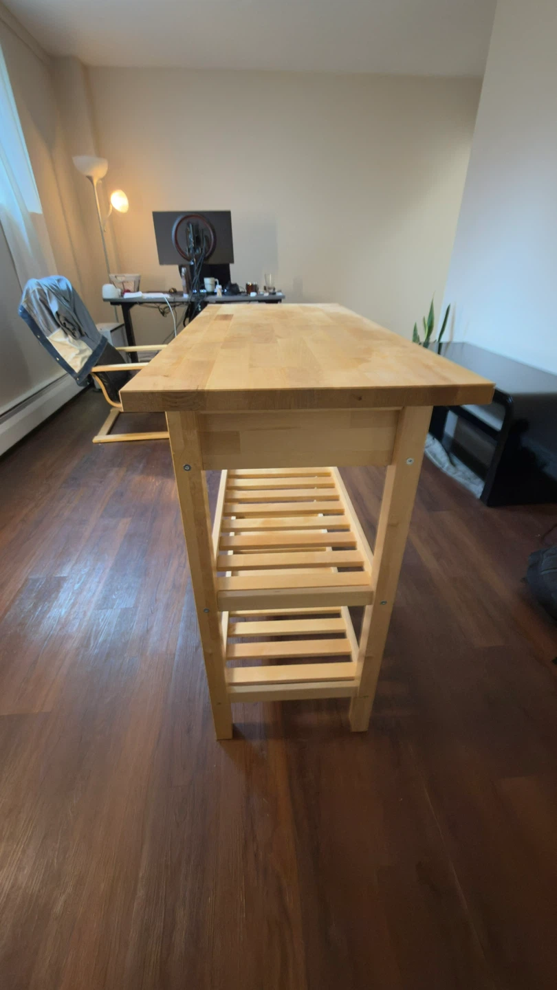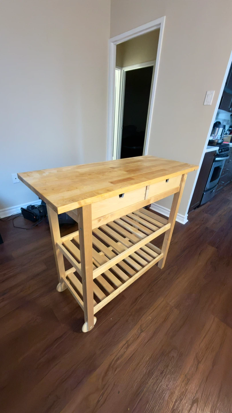 This kitchen island cart features a butcher block style top with two drawers for storage. It also has multiple slatted shelves on the side for additional space. The cart has wheels for easy mobility.
