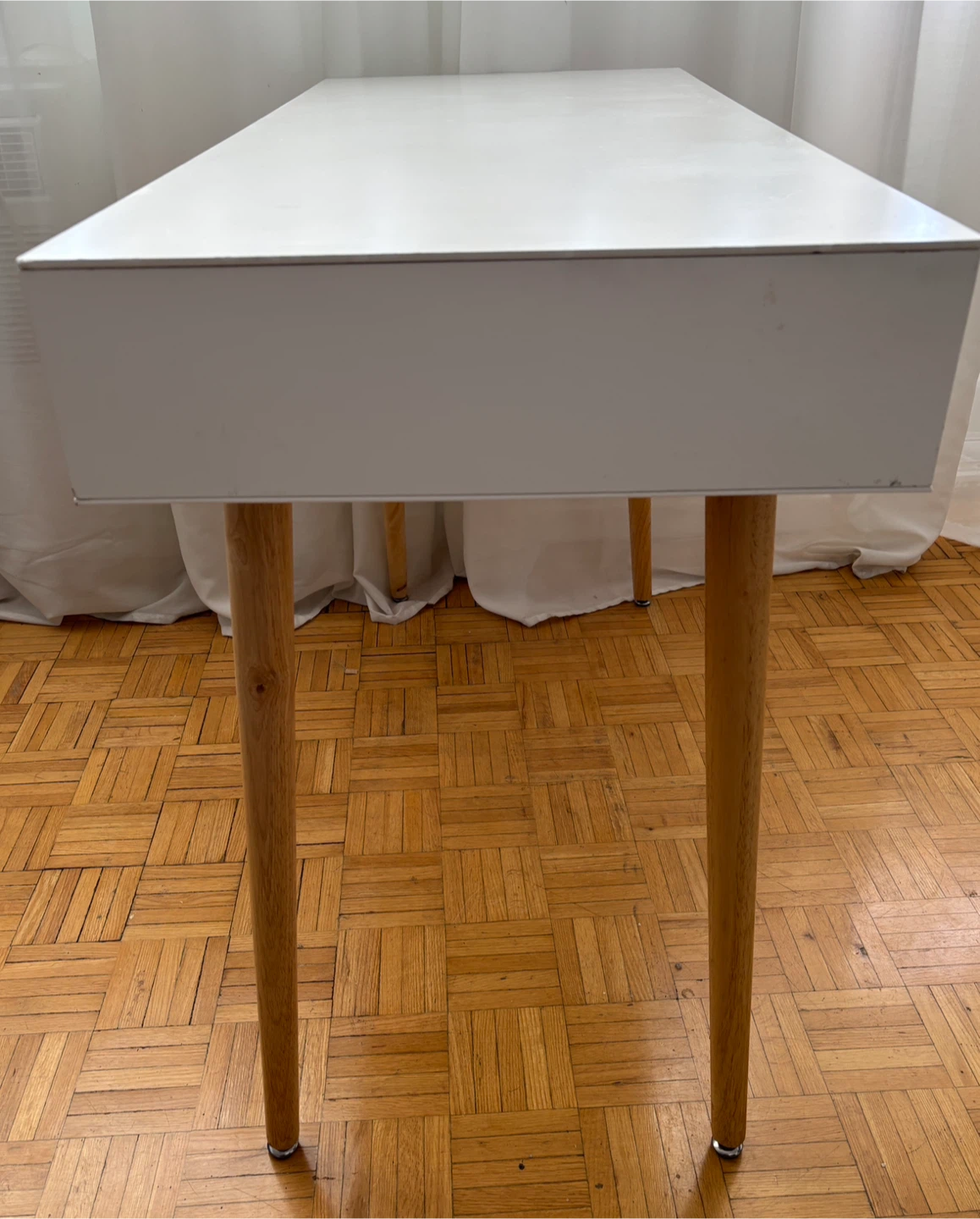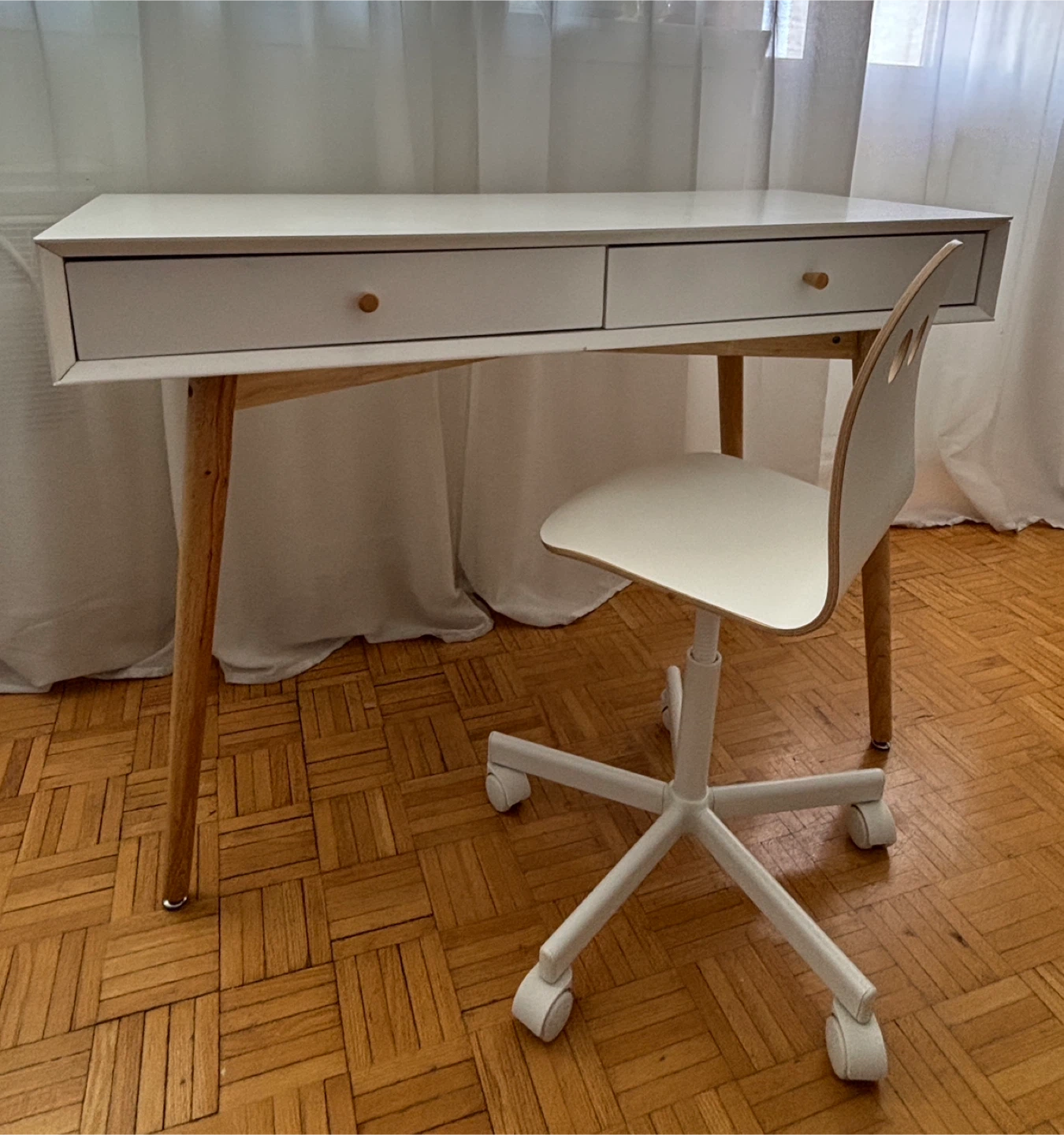 White desk with two drawers and wooden legs with adjustable level plus chair.