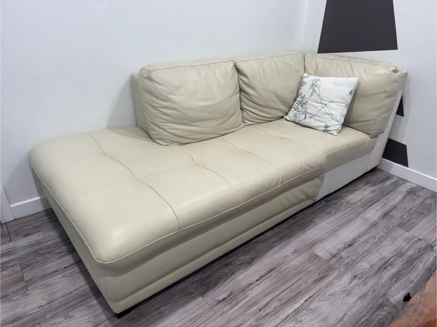 Cream leather chaise lounge sofa with tufted seat cushions. Comes with a decorative throw pillow. Measures approximately 70 inches in length.