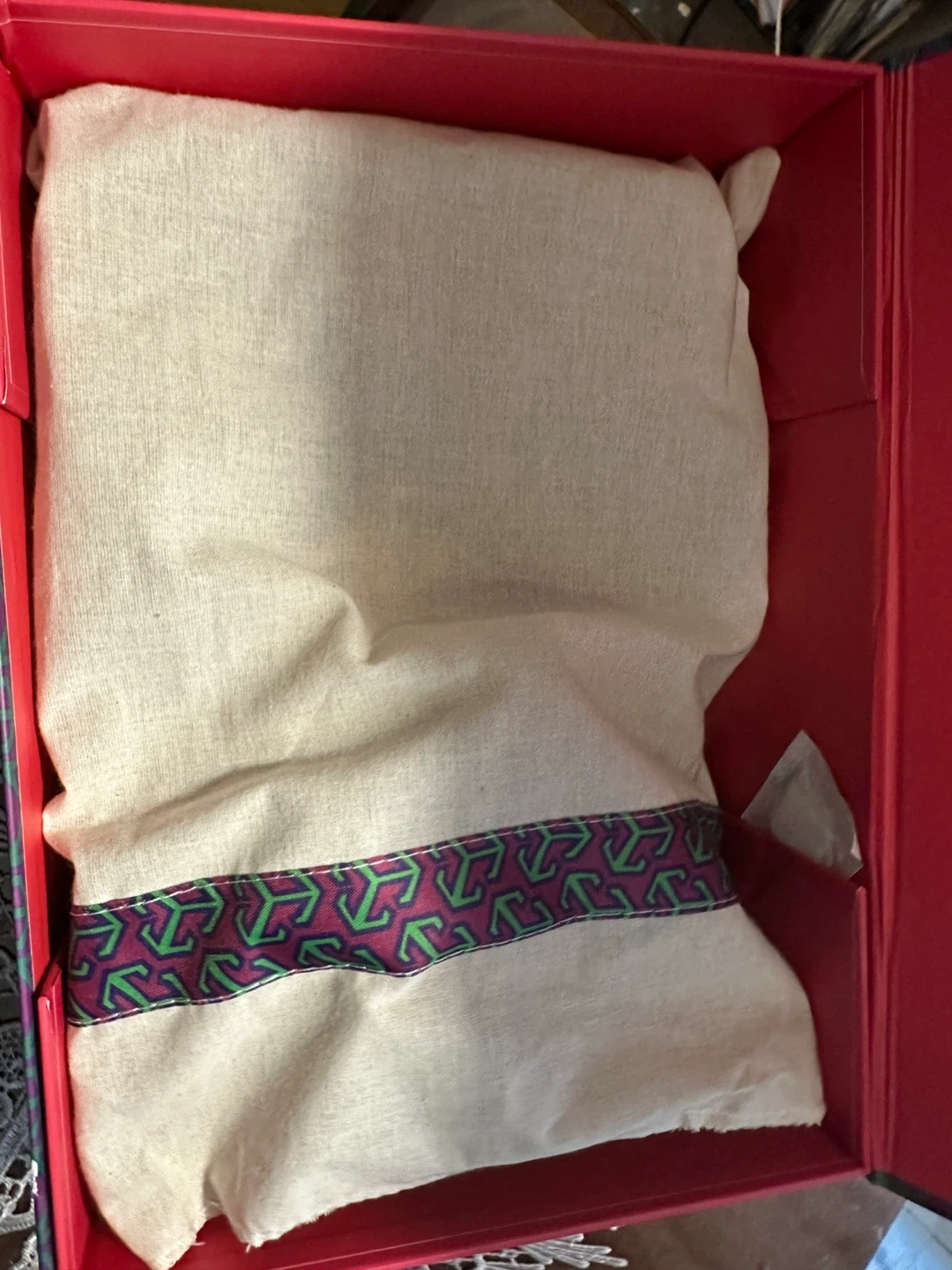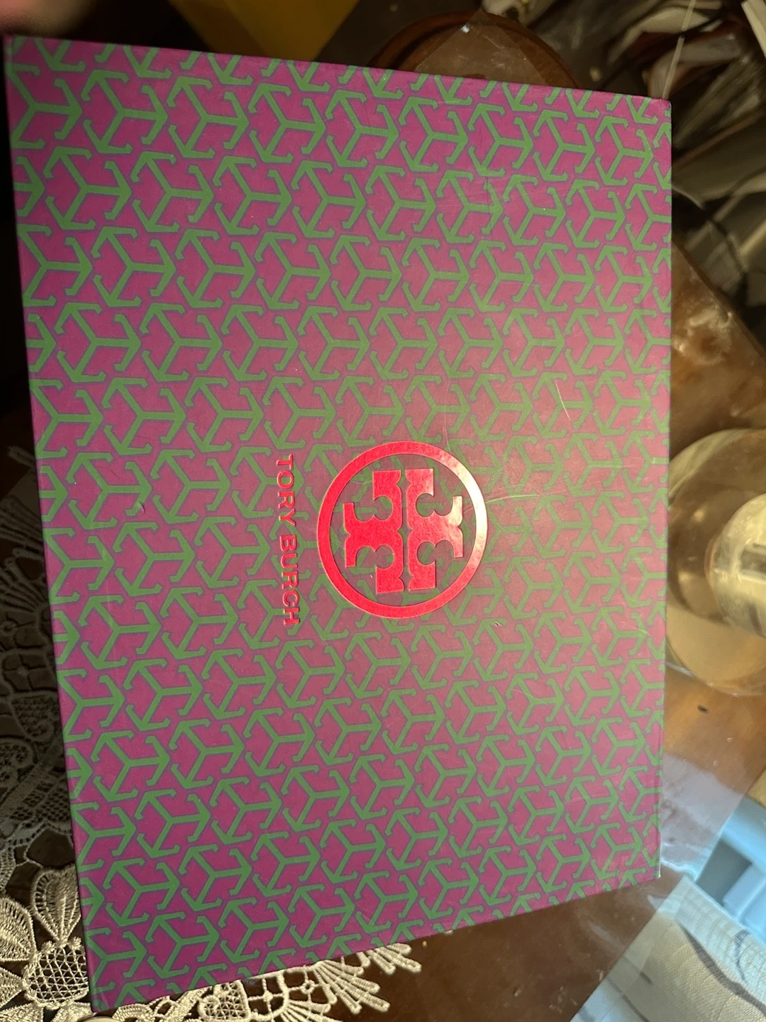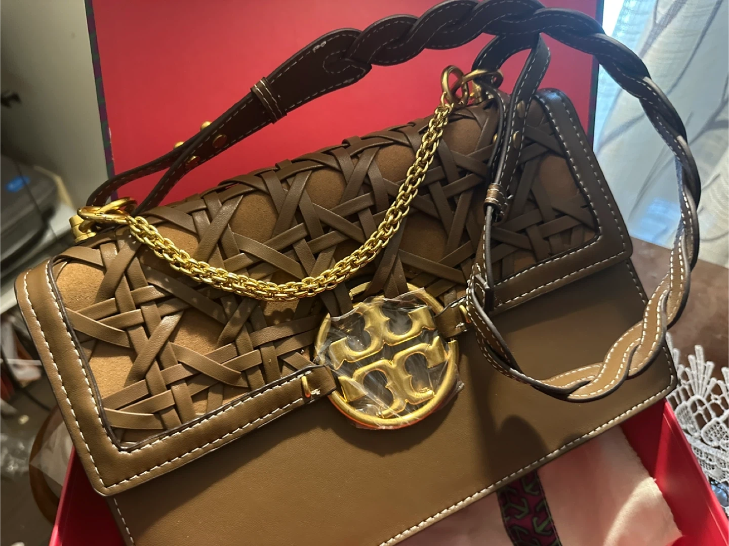 This is a Tory Burch handbag with a braided strap and gold chain detail. It comes with its original box and dust bag. The bag's exterior is brown leather with woven accents.