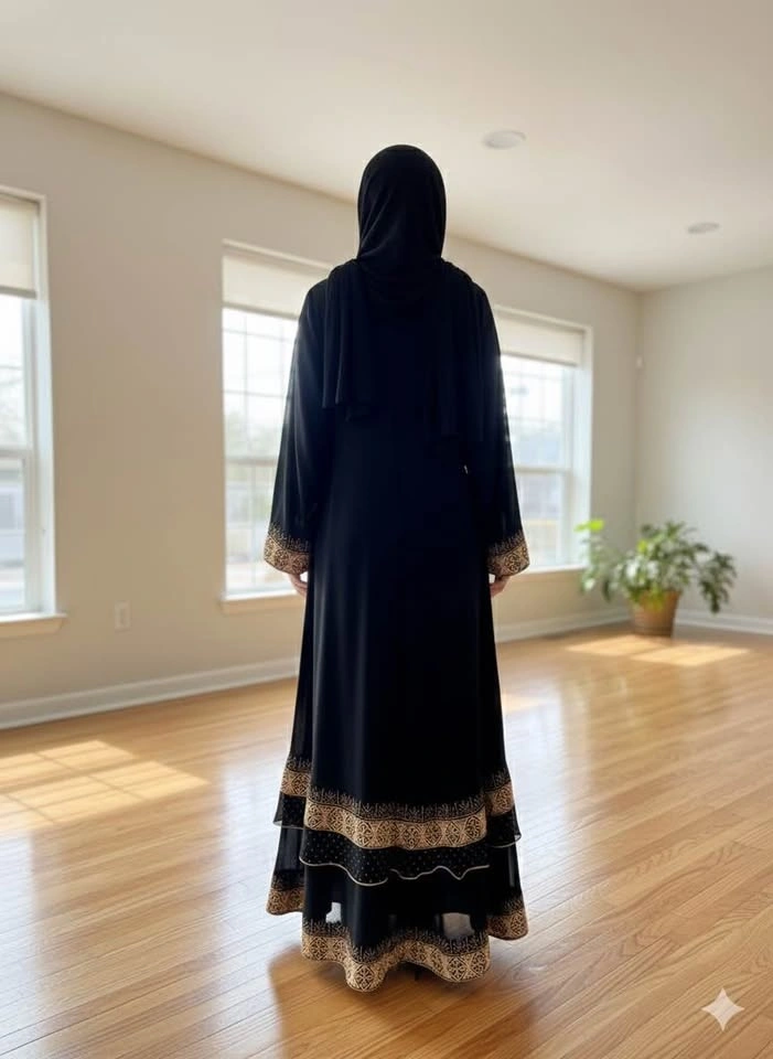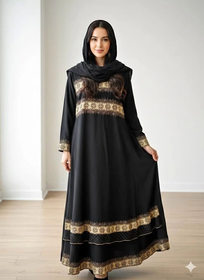 Beautiful black abaya with stunning gold embroidery. Features intricate patterns on the chest, sleeves, and a tiered hem. Comes with a matching black scarf. Perfect for special occasions or everyday elegant wear.