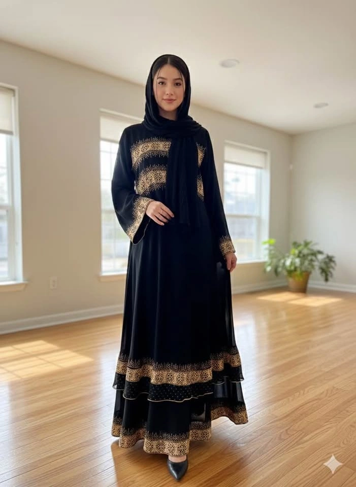 Beautiful black abaya with stunning gold embroidery. Features intricate patterns on the chest, sleeves, and a tiered hem. Comes with a matching black scarf. Perfect for special occasions or everyday elegant wear.