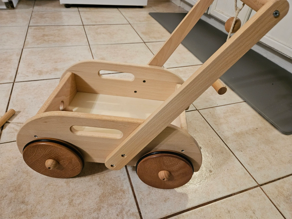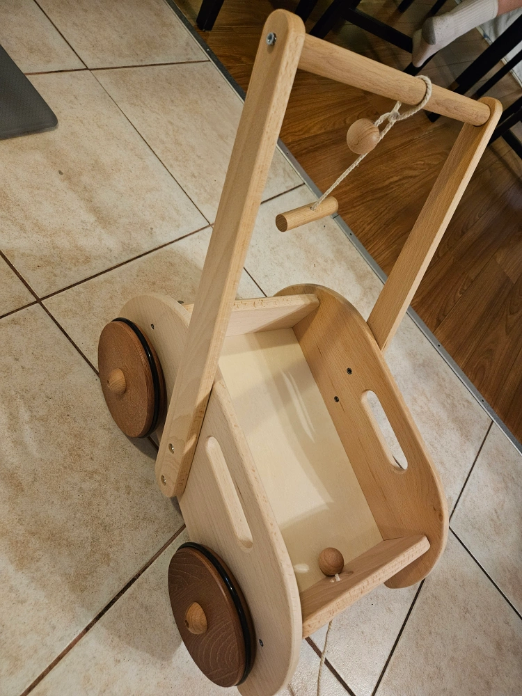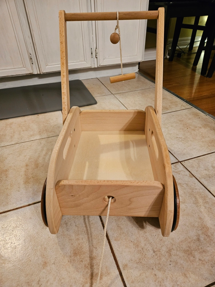 Adorable wooden walker for toddlers. Features a pull-along string and removable handle. Solid wood construction, four wheels. Great for imaginative play.